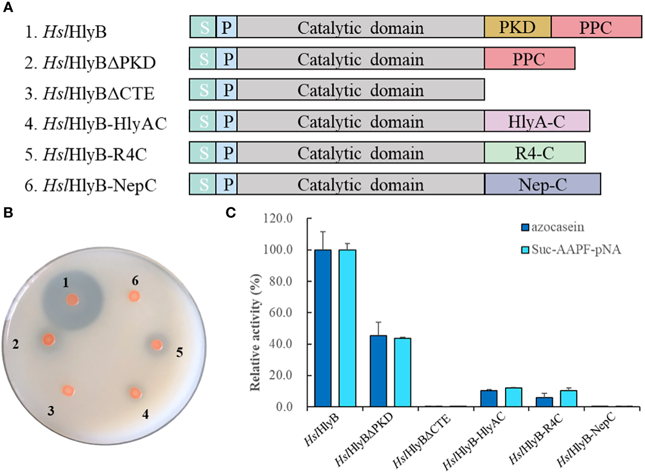 Effect of CTE on HslHlyB activity. (A) Domain arrangement of HslHlyB and the chimeras. S: signal peptide, P: propeptide, PKD: polycystic kidney disease domain, PPC: prepeptidase C-terminal domain, HlyA-C:C-terminal extension of HlyA, R4-C: C-terminal extension of R4, Nep-C: C-terminal extension of Nep. (B) Hydrolysis of skim milk by recombinant Hfx. volcanii cells on YPC agar plates. (C) Azocasein and Suc-AAPF-pNA hydrolytic activity of cell-free culture supernatants of recombinant Hfx. volcanii. 1, HslHlyB; 2, HslHlyBΔPKD; 3, HslHlyBΔCTE; 4, HslHlyB-HlyAC; 5, HslHlyB-R4C; 6, HslHlyB-NepC.