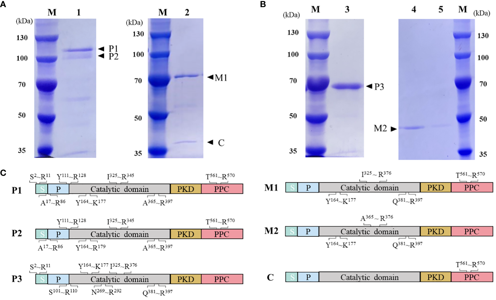 Purification and on-column refolding of HslHlyB and HslHlyBΔCTE. (A) SDS-PAGE analysis of HslHlyB precursor and mature HslHlyB. (B) SDS-PAGE analysis of HslHlyBΔCTE precursor and mature HslHlyBΔCTE. (C) MALDI-TOF/TOF MS analysis of protein bands in SDS-PAGE analysis. Sequenced tryptic peptides are marked. P1 and P2: HslHlyB precursor, P3, HslHlyBΔCTE precursor; C, the cleaved C-terminal fragments; M1, mature HslHlyB; M2, mature HslHlyBΔCTE; M, marker; lane 1, recombinant HslHlyB precursor purified under denaturing conditions; lane 2, refolded product of HslHlyB precursor; lane 3, recombinant HslHlyBΔCTE precursor purified under denaturing conditions; lane 4-5, refolded product of HslHlyBΔCTE precursor; S, signal peptide; P, propeptide; PKD, polycystic kidney disease domain; PPC, prepeptidase C-terminal domain.