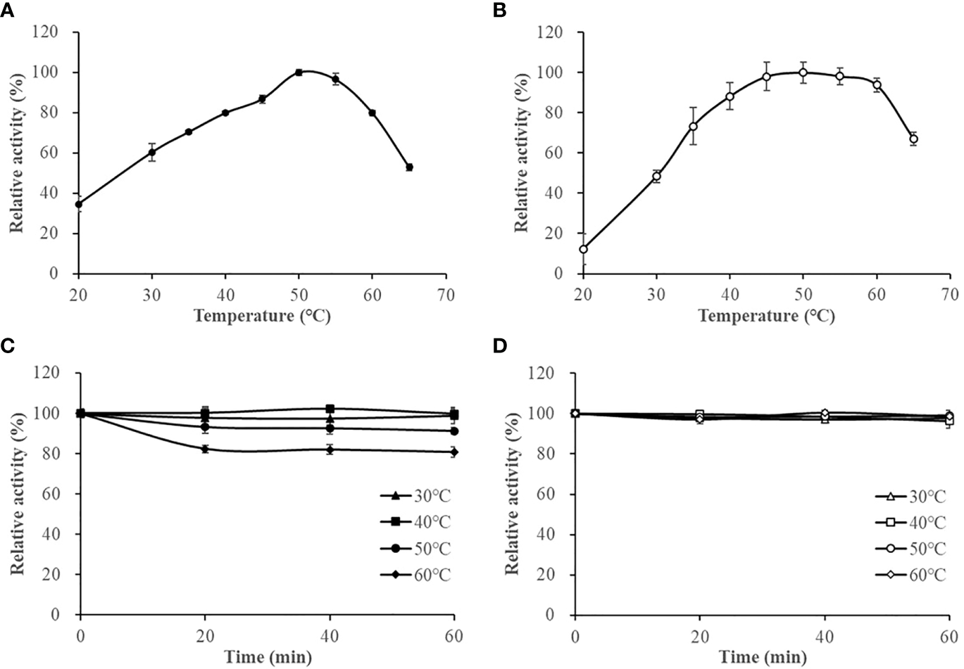 The effect of temperature on HslHlyB (A) and HslHlyBΔCTE activity (B), and the thermal stability of HslHlyB (C) and HslHlyBΔCTE (D). In (A, B), relative activities were calculated with the maximal activity defined as 100%. In (C, D), the initial enzyme activity was set as 100%, upon which the relative activities of enzymes after incubation at different temperatures for 20, 40 or 60 min were calculated. Mean ± SD of three biological replicates.