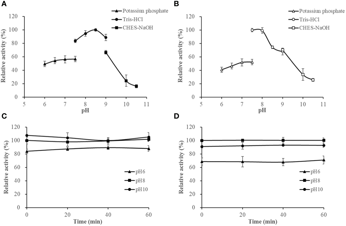 The effect of pH on HslHlyB (A) and HslHlyBΔCTE activity (B), and the pH stability of HslHlyB (C) and HslHlyBΔCTE (D). In (A, B), relative activities were calculated with the maximal activity defined as 100%. In (C, D), the initial enzyme activity at pH 8.0 was set as 100%, upon which the relative activities of enzymes after incubation at different pH for 20, 40 or 60 min were calculated. Mean ± SD of three biological replicates.