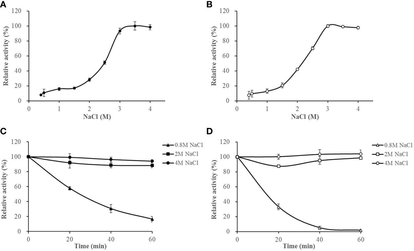 The effect of NaCl on HslHlyB (A) and HslHlyBΔCTE activity (B), and the salinity stability of HslHlyB (C) and HslHlyBΔCTE (D). In (A, B), relative activities were calculated with the maximal activity defined as 100%. In (C, D), the initial enzyme activity was set as 100%, upon which the relative activities of enzymes after incubation at different salinities for 20, 40 or 60 min were calculated. Mean ± SD of three biological replicates.