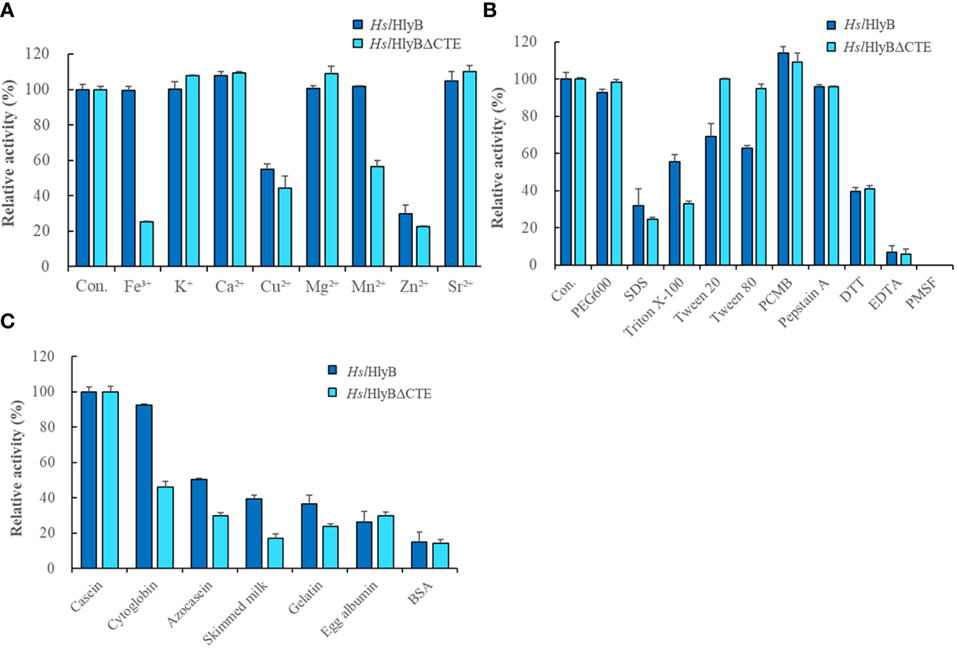 HslHlyB and HslHlyBΔCTE can hydrolyze casein, bovine hemoglobin, azocasein, skim milk, gelatin, egg albumin and bovine serum albumin, with the highest catalytic activity towards casein (Figure 7C). Their wide substrate spectra make them good candidates for industrial applications.