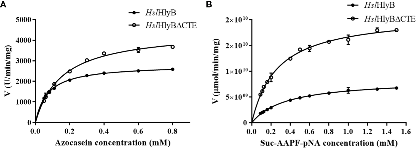 Michaelis-Menten graph of HslHlyB and HslHlyBΔCTE against azocasein (A) and Suc-AAPF-pNA (B). Mean ± SD of three biological replicates.