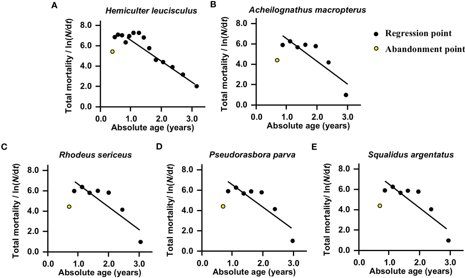 Length-converted catch curves of (A)Hemiculter leucisculus, (B)Acheilognathus macropterus, (C)Rhodeus sericeus, (D)Pseudorasbora parva, and(E)Squalidus argentatus in the lower reaches of the Songhua River. The slope of each straight line is the total instantaneous mortality rate (Z) of the target fish population.
