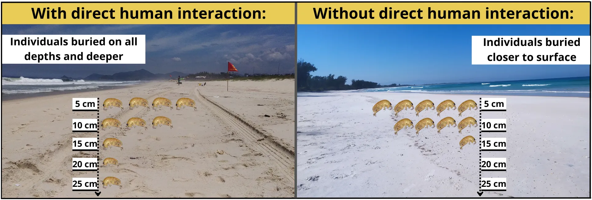 Given this context, the primary objective of this study was to investigate whether the direct human interference on beach is capable of affecting the burying behavior of A. brasiliensis. This study thus aims to expand the knowledge on the burial behavior and its plasticity of the Talitridea bioindicator for beach environmental quality, as a response mechanism to direct human pressures. We hypothesize that on beaches frequented by humans, trampling, and use of heavy cleaning machinery, talitrids bury themselves deeper. To verify this hypothesis, differences in the depth of burial and individual characteristics, such as sex and age group, were evaluated for beaches frequented and trampled, and beaches without direct human interference.