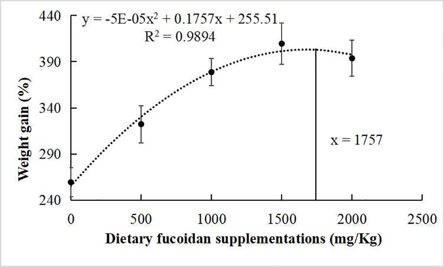 Broken line regression analysis between dietary fucoidan supplementation and weight gain of juvenile Cyprinus carpio.
