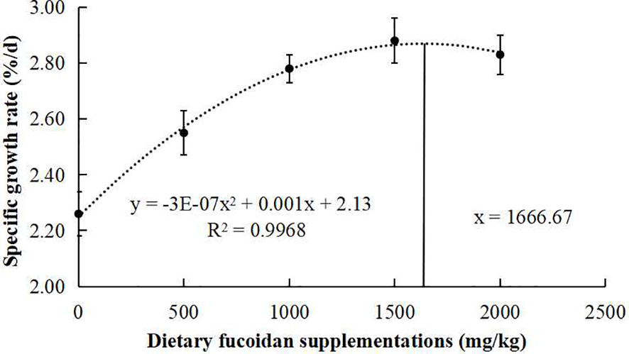 All of the data were expressed as the mean ± SEM. The data were analyzed by one-way analysis of variance and Tukey’s multiple range test using SPSS 19.0 (IBM, Chicago, USA). Differences were considered significant at p< 0.05. The optimal dietary requirement of fucoidan for juvenile carp was calculated by using broken line regression analysis (Robbins et al., 2006).