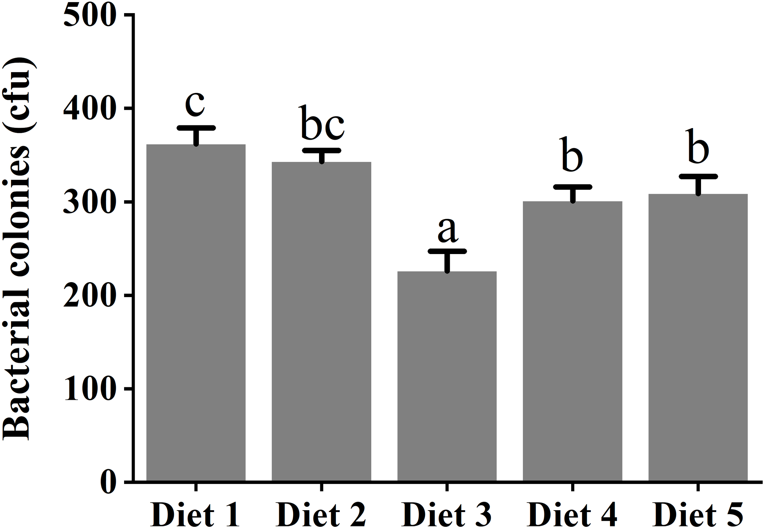 Challenge with Aeromonas hydrophila in serum of juvenile Cyprinus carpio fed dietary fucoidan. Different superscript letters indicate marked differences among the groups (p< 0.05). Diet 1, Diet 2, Diet 3, Diet 4, and Diet 5 refer to fish fed diets with varying levels of fucoidan (0, 500, 1,000, 1,500, and 2,000 mg/kg).