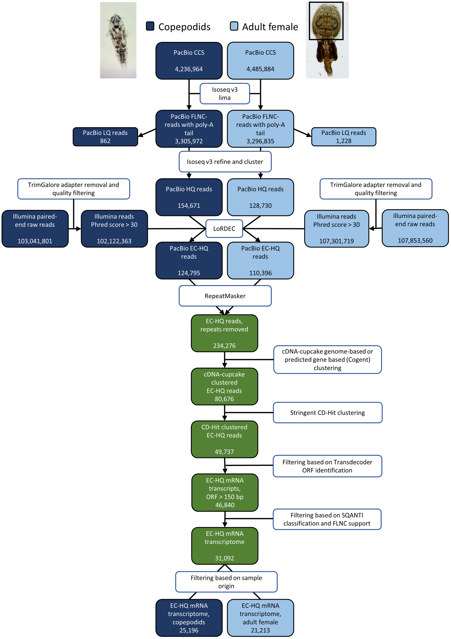 Overview of the process from raw sequencing reads to the final, EC-HQ mRNA transcriptome including number of reads in the output of PacBio and Illumina sequencing and number of sequences obtained in each step of the transcriptome assembly pipeline for the two samples copepodids and adult female.