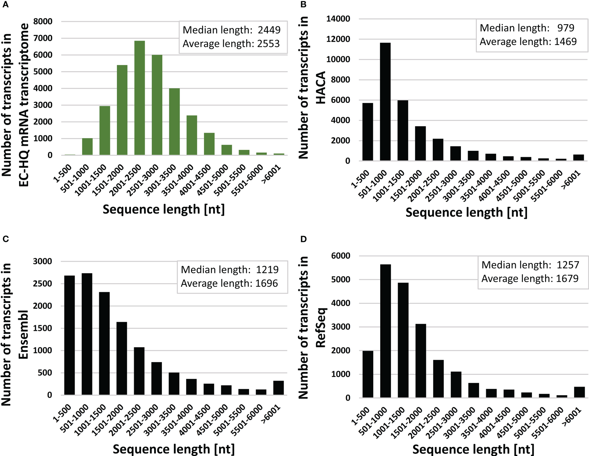 Transcript length distributions with median and average length values of (A) full-length error corrected mRNA transcriptome (GKKU00000000), (B) the HACA00000000.1 transcriptome assembly (HACA)Carmona-Antonanzas et al. (2015)(C) the Ensembl cDNA [Skern-Mauritzen et al. (2021); Cunningham et al. (2022)] and (D) NCBI RefSeq mRNA O’Leary et al. (2016) for L. salmonis.