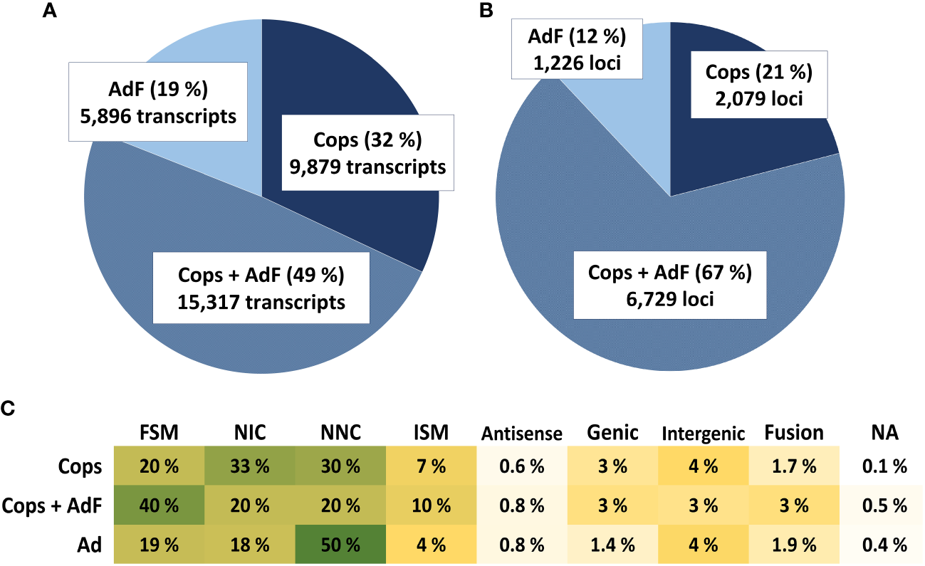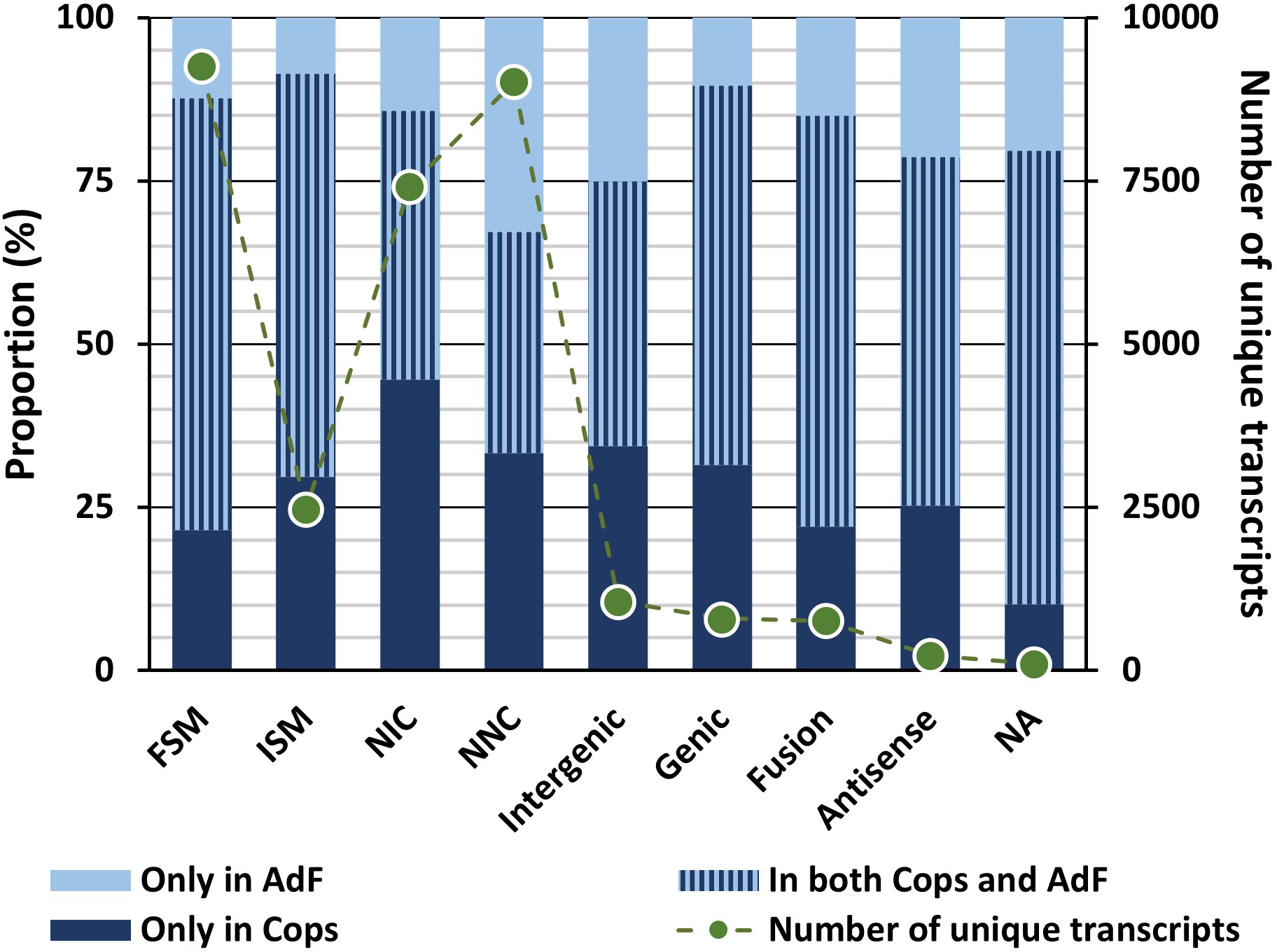 Transcripts classified as full splice-match (FSM) represent identical matches (≥ 95% sequence identity) to a predicted transcript in the genome, and these data thus represent experimental validation of 9,247 predicted transcripts of the UVic_Lsal_1.2 genome. In total, transcripts mapping a known reference (FSM and ISM) accounted for 38% of the transcripts according to the SQANTI classification. Of these, 2,540 were exact reference matches with less than 50 nucleotide difference in transcription start/stop site between the transcript and the reference. Transcripts that are common for both samples (in both cops and AdF) dominate the FSM and ISM groups (66% and 62% respectively, Figure 4).