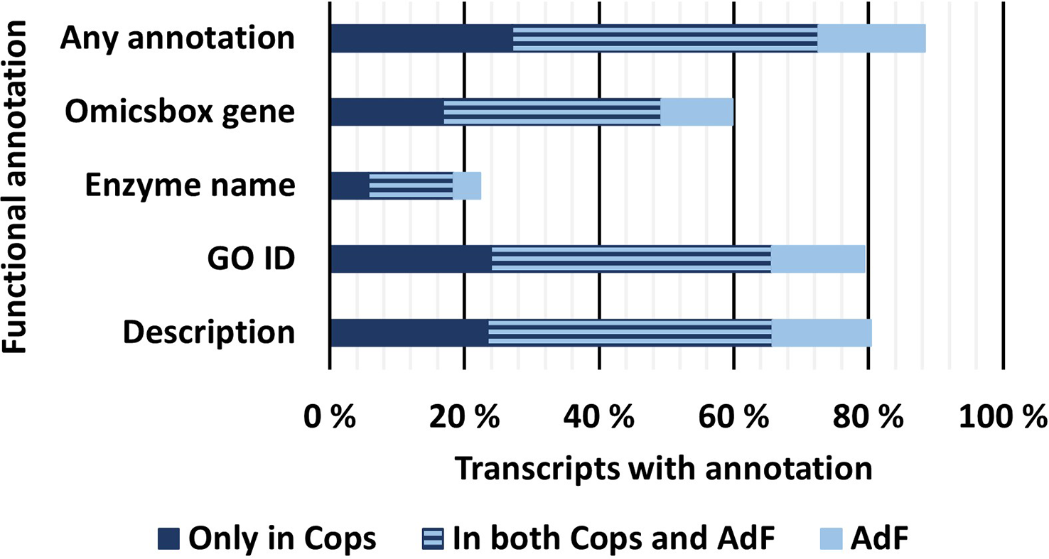 The final FL transcriptome was subjected to further functional annotation using OmicsBox based on the GO terms and a blastp analysis of the predicted amino acid sequences. An overview of the percentage of transcripts for each annotation type is shown in Figure 5. The functional annotation was also carried out separately on the transcriptomes from each of the copepodid and adult samples. In the final mRNA transcriptome including both samples, 79% of the transcripts were successfully annotated with at least one GO term and 80% of the transcripts received a description, based on the top 20 blast hits (OmicsBox). Furthermore, 22% of the transcripts were predicted enzymes and assigned an enzyme name and Enzyme Code (OmicsBox). Altogether, 88% of the data is annotated by one or more GO terms and/or a description from OmicsBox. Functional annotations associated with each unique transcript ID are included in Supplementary File S1.1.