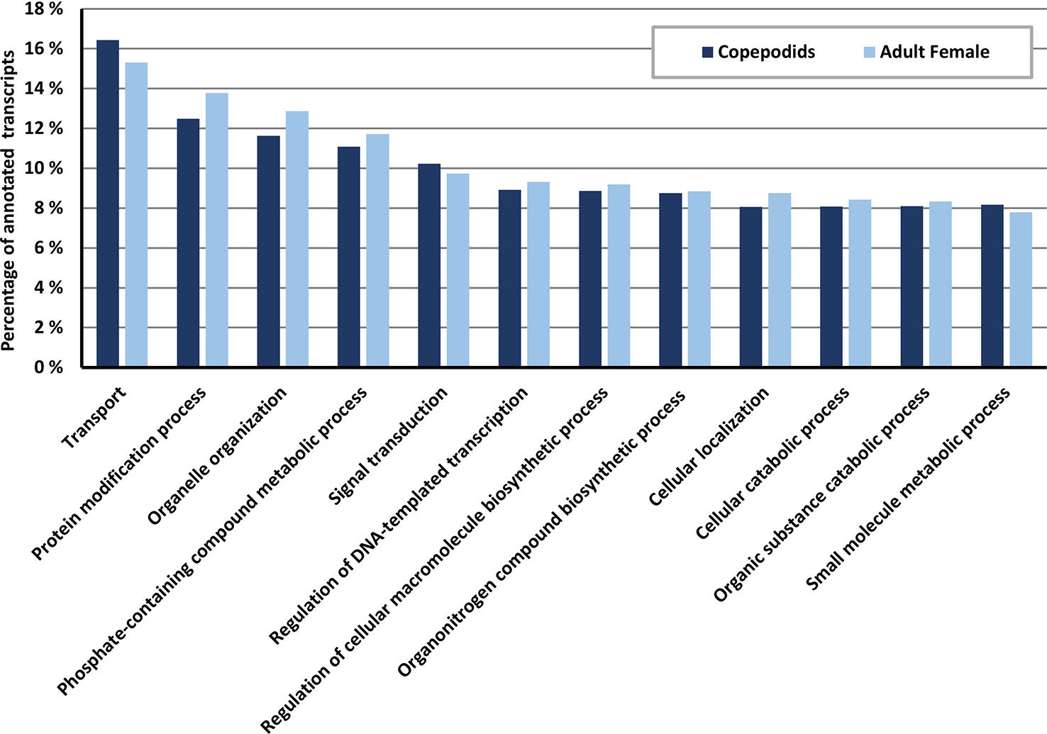 The GO annotations show a similar pattern for copepodids and AdF salmon lice within the most abundant GO categories of the biological process category (Figure 7). The most dominant biological process GO term is transport, followed by protein modification process and organelle organization.