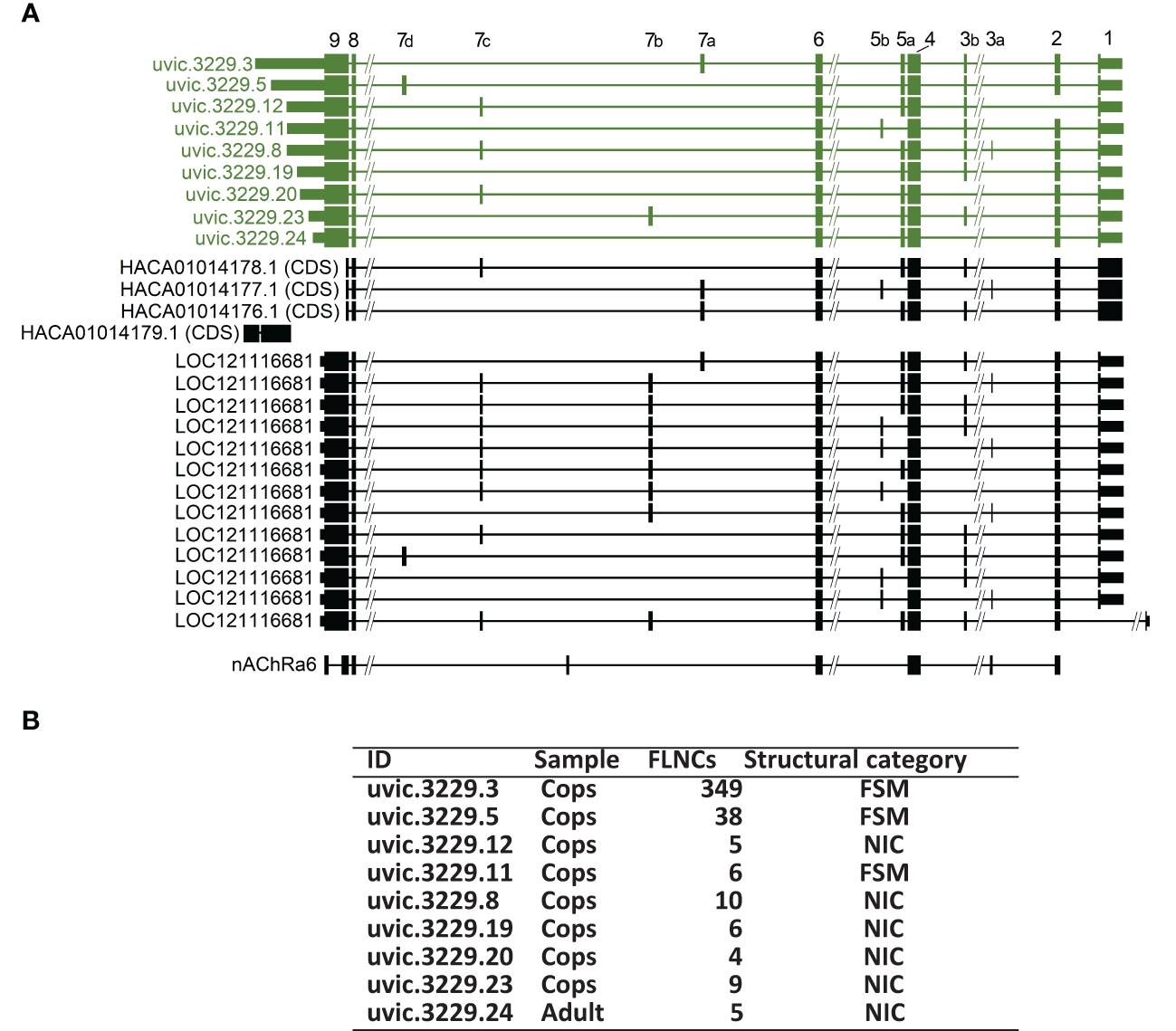Until now, one transcriptome shotgun assembly (TSA) was published in GenBank (HACA00000000.1), hereby referred to as HACA. It is based on a pool of total RNA from samples of all life stages except chalimus 1 and 2 (Carmona-Antonanzas et al., 2015). This transcriptome assembly was created using a contig-level genome. Currently, both the Ensembl (Skern-Mauritzen et al., 2021; Cunningham et al., 2022) and the RefSeq transcriptomes (Joshi et al., 2022) are collections of transcripts solely predicted from short-read RNA datasets aligned against genome assemblies for L. salmonis. The Ensembl transcriptome, also available in LiceBase (licebase.org) (Skern-Mauritzen et al., 2021), has been extensively used as a reference in differential expression analyses (Eichner et al., 2018; Heggland et al., 2020; Borchel et al., 2022). The NCBI RefSeq mRNAs are predicted and based on the newest reference genome UVic_Lsal_1.2 (Joshi et al., 2022). So far, mRNA sequences generated by long-read sequencing technology has not yet been published for L. salmonis.