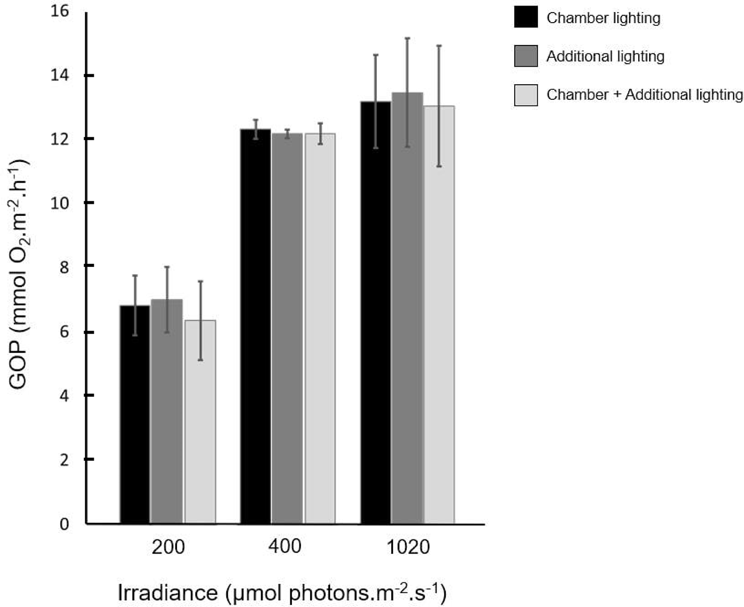 Gross oxygen production measured for 3 light intensities under 3 different light sources: chamber daylight lighting (black), additional daylight lighting (dark grey) and chamber combined to additional daylight lighting (light grey).