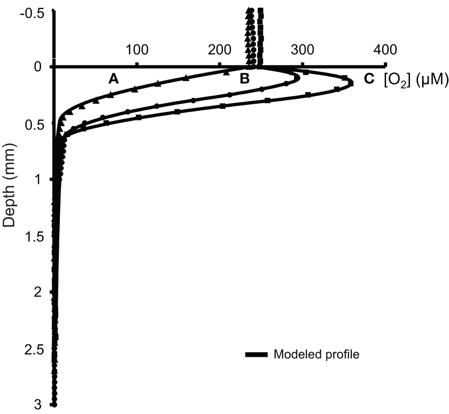 Raw oxygen concentrations measured under 3 light intensities versus depth in the superficial sediments with associated model fits. Profile (A) 0 µmol photons.m-2.s-1, profile (B) 565 µmol photons.m-2.s-1 and profile (C) 1650 µmol photons.m-2.s-1.