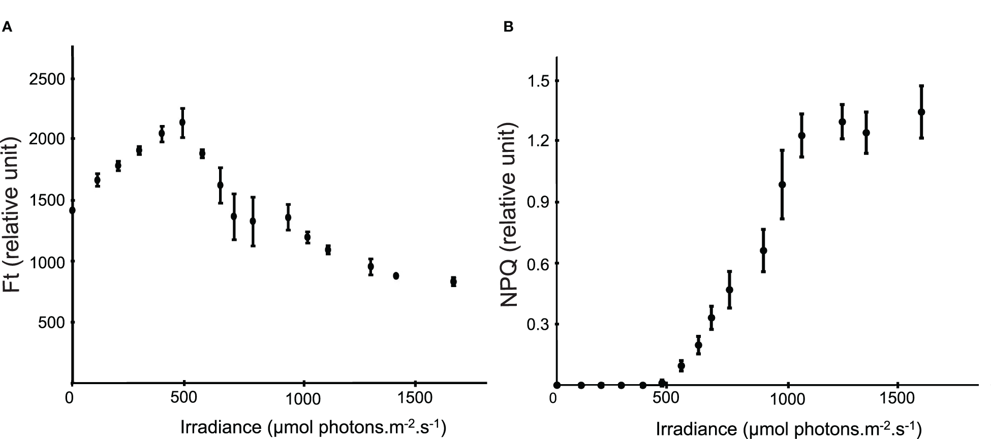 (A) Instantaneous fluorescence (Ft) according to the light intensity (each point corresponds to the mean ± s.d. of 14 Ft measurements, i.e. measurements performed every 3 minutes during 44 minutes). (B) Non photochemical quenching (NPQ) according to the light intensity (each point corresponds to the mean ± s.d. of 14 NPQ measurements, i.e. measurements performed every 3 minutes during 44 minutes).