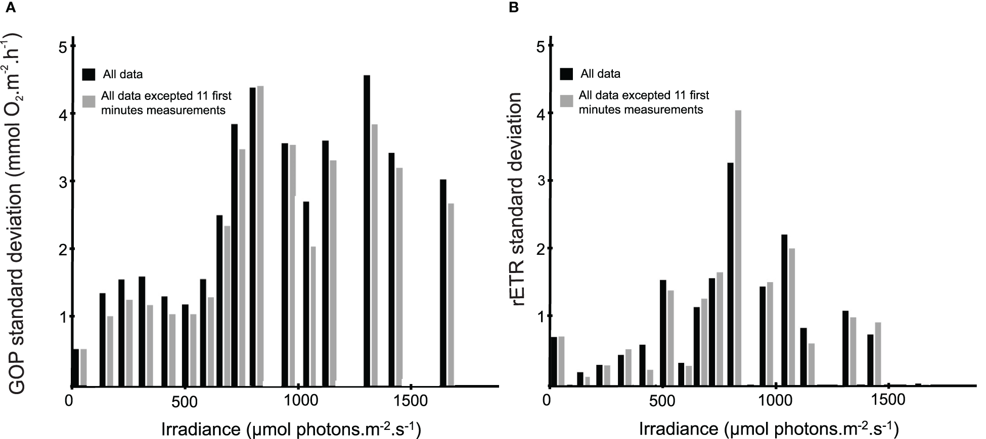 Standard deviation as a function of the light intensity based on GOP (A) and rETR (B). Black sticks correspond to s.d. calculated on all data (n=8 for GOP and n=14 for rETR) and grey sticks correspond to s.d. calculated on all data excluding the 11 first minutes (n=6 for GOP and n=10 for rETR).