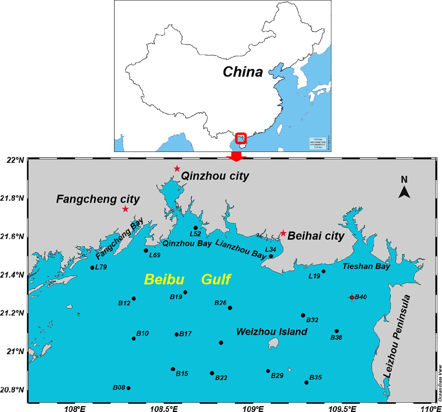 The Beibu Gulf is surrounded by the Leizhou Peninsula, Qiongzhou Strait, Hainan Island, Vietnam, and the Guangxi Province. It covers an area of 1.3 × 105 km2 and is a typical semi-closed gulf with an average depth of approximately 38 m (Zhang et al., 2020). The climate around the gulf is subtropical and monsoonal (Chen et al., 2009). The Beibu Gulf has abundant bays and seagoing rivers. Environmental and climatic advantages make the Beibu Gulf one of the four largest fishing bases in China. Moreover, its wide shallow sea and mudflats make it suitable for the breeding and growth of multiple marine organisms. In 2015, the production of marine aquaculture and open water fishing yielded 1.8 million tonnes in Guangxi province (The Oceanic Administration of Guangxi, 2017). Moreover, planting has been an important part of Guangxi’s agricultural industry, accounting for 51.1% in 2016, and the crop planting area reached 7204,100 ha by 2020 (The Statistical Bureau of Guangxi, 2020). In particular, fruit production in Guangxi is among the highest in the country. Intensive agricultural and aquaculture activities have been identified as the main sources of pesticide pollution in coastal areas (Zhang et al., 2021b).