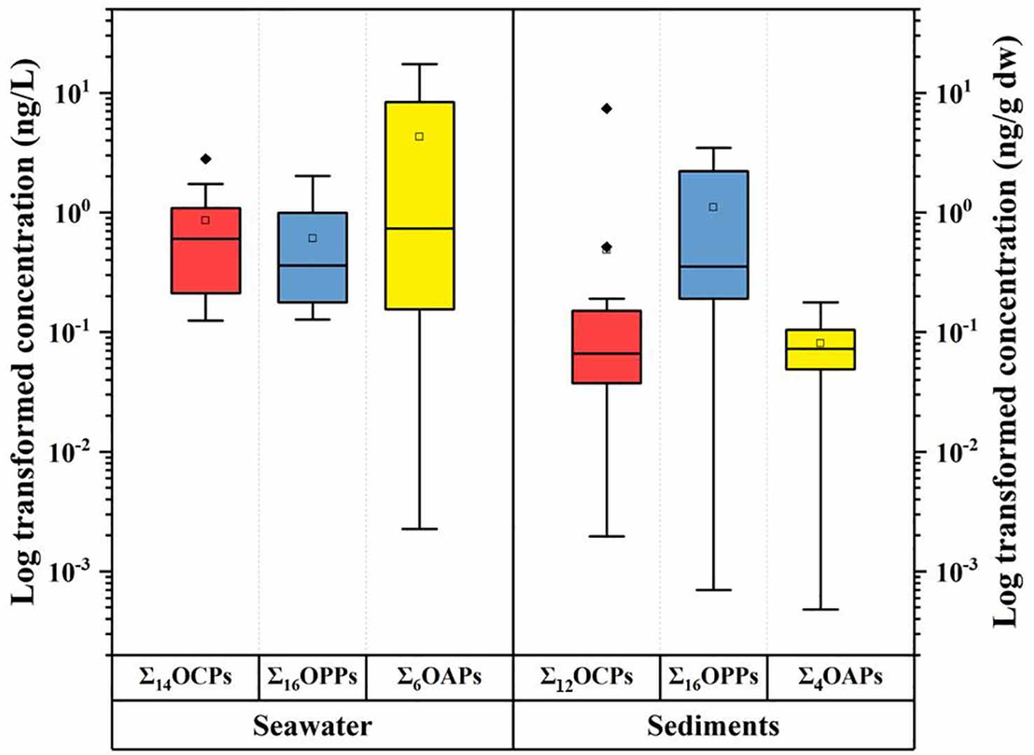Concentration comparisons of Σ14OCPs, Σ16OPPs, and Σ6OAPs in both seawater and sediment. Σ14OCPs, Σ16OPPs, Σ6OAPs equals to the sum concentration of 14 OCPs, 16 OPPs, and 6 OAPs, respectively. The diamond represents outlier’s value and the square represents mean value.