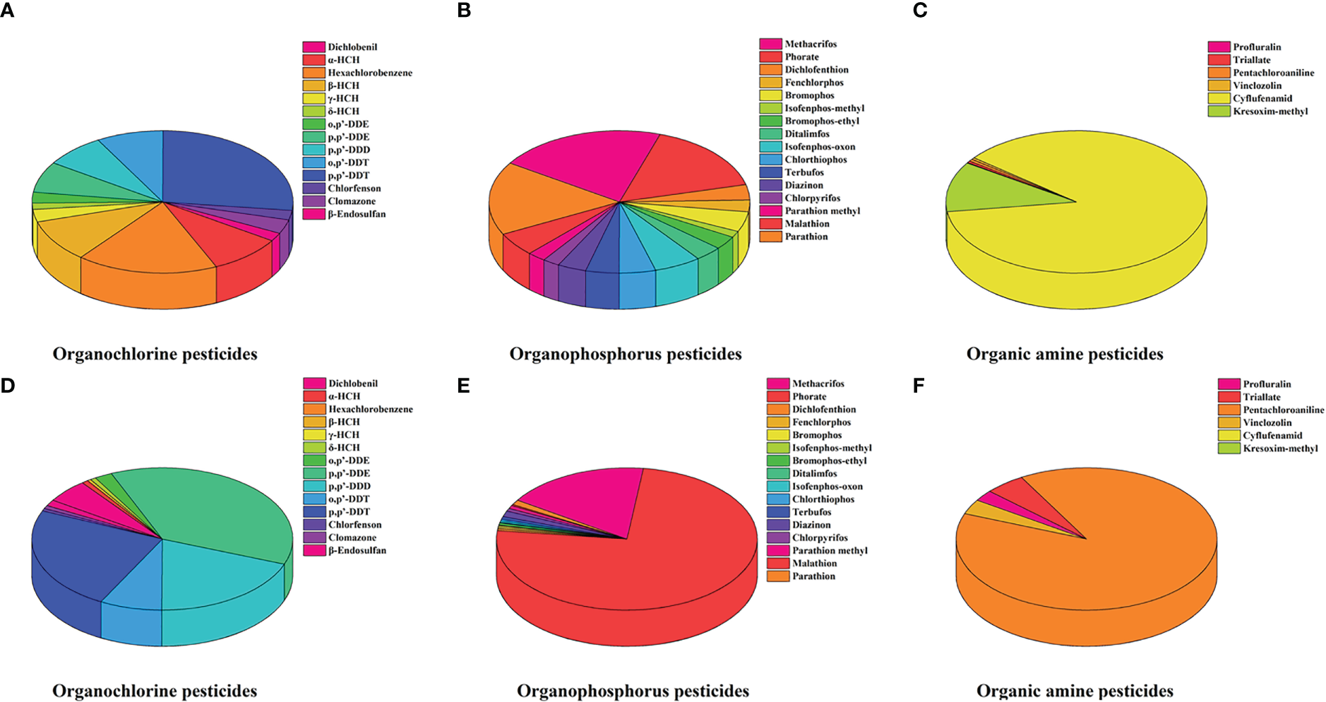 Percentage composition of individual pesticides (A-C) in surface seawater, and (D-F) in sediments.