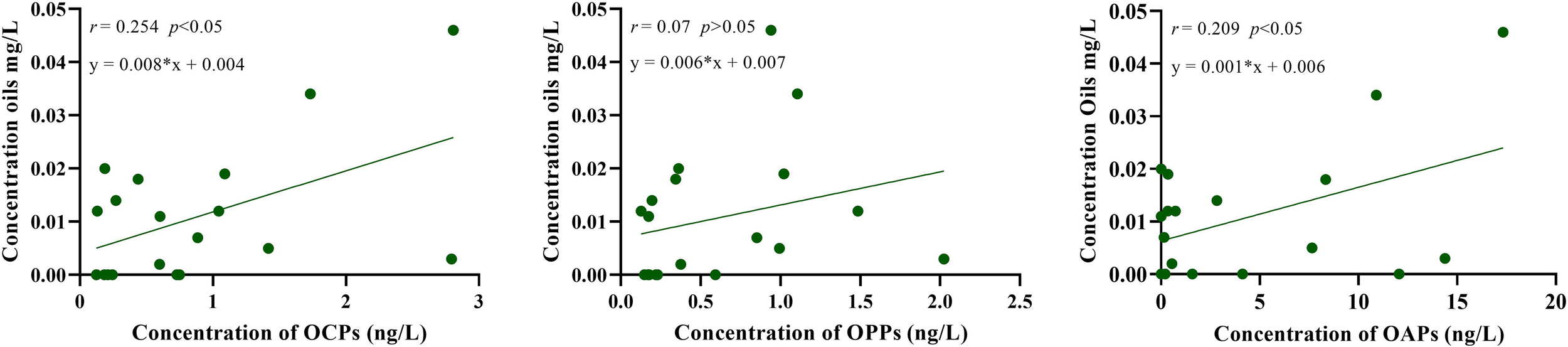 The extraction of multi-class pesticides from sediments was performed using ultrasonic-assisted extraction. Twelve grams of homogenized sediment were added to a 100 mL glass jar and spiked with heptachlor-exo-epoxide (100 µL, 1 mg/L) as the internal standard. Subsequently, 25 mL dichloromethane solution was added and ultrasonic-assisted extraction was performed for 30 min, followed by centrifugation at room temperature for 10 min at 3500 rpm thrice. The combined supernatant was passed through a silica stainless steel column for purification and then transferred to a 200 mL nitrogen-blow tube. Thereafter, the same process as that of the water samples was applied. The total organic carbon (TOC) in the sediment were measured by quantifying CO2 using a TOC Analyzer (Vario TOC cube, Elementar, Germany). And related values were listed in Table S1. The oil content in the seawater was measured using ultraviolet spectrophotometry (UH5700, HITACHI, Japan).