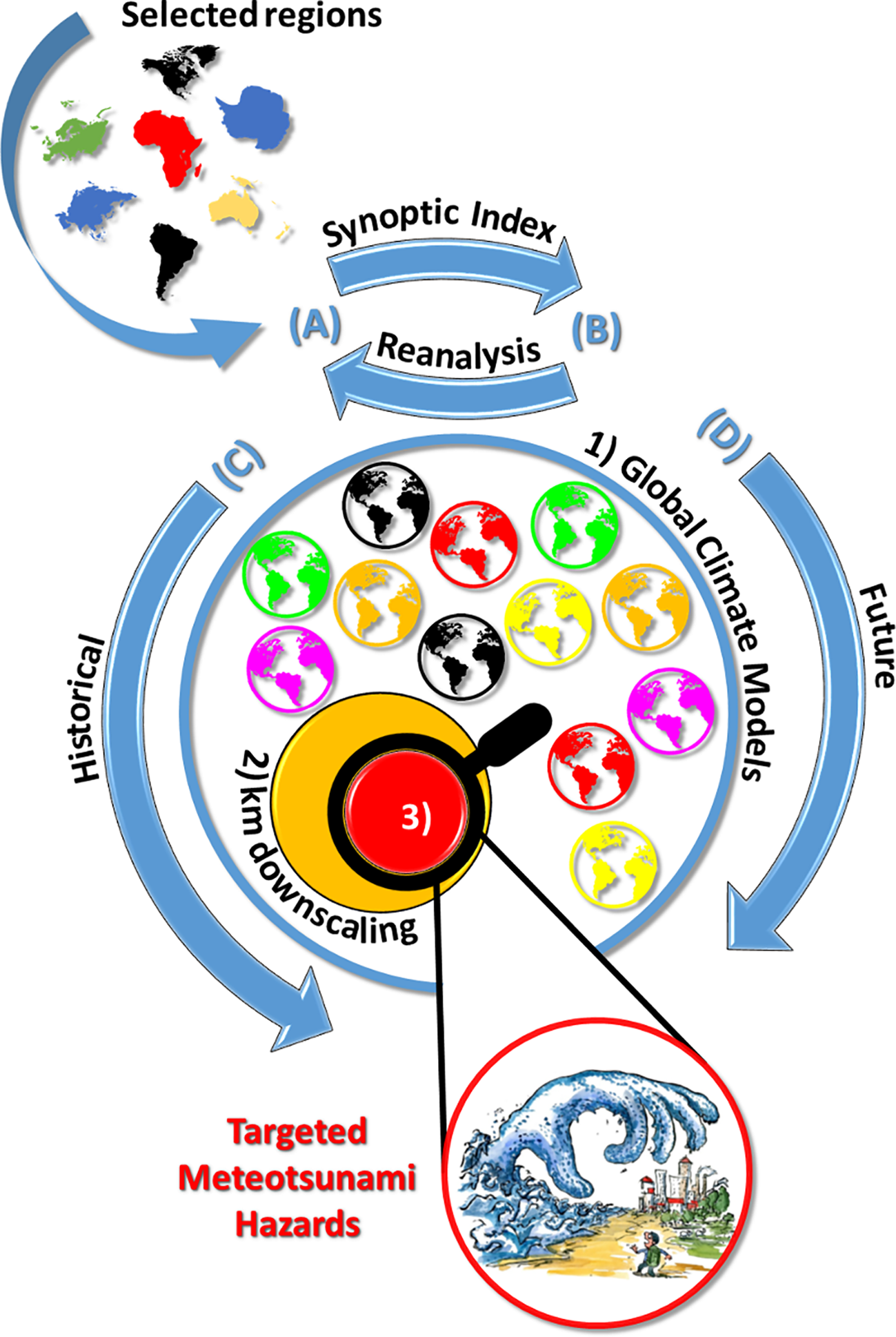Outline of the methodology using (A) synoptic indices designed with (B) global reanalysis products to derive targeted meteotsunami hazards by downscaling (C) historical and (D) future GCM simulations. For a selected region: (1) the synoptic index is used to automatically extract extreme events from GCM ensembles (blue circle), (2) the GCM results are downscaled to kilometre-scale for all chosen events (orange circle) and (3) the kilometre-scale simulations with extreme event realizations (red circle) are further downscaled to sub-kilometre-scale and targeted hazard assessment projections are derived. Artwork from Frits Ahlefeldt: https://fritsahlefeldt.com.
