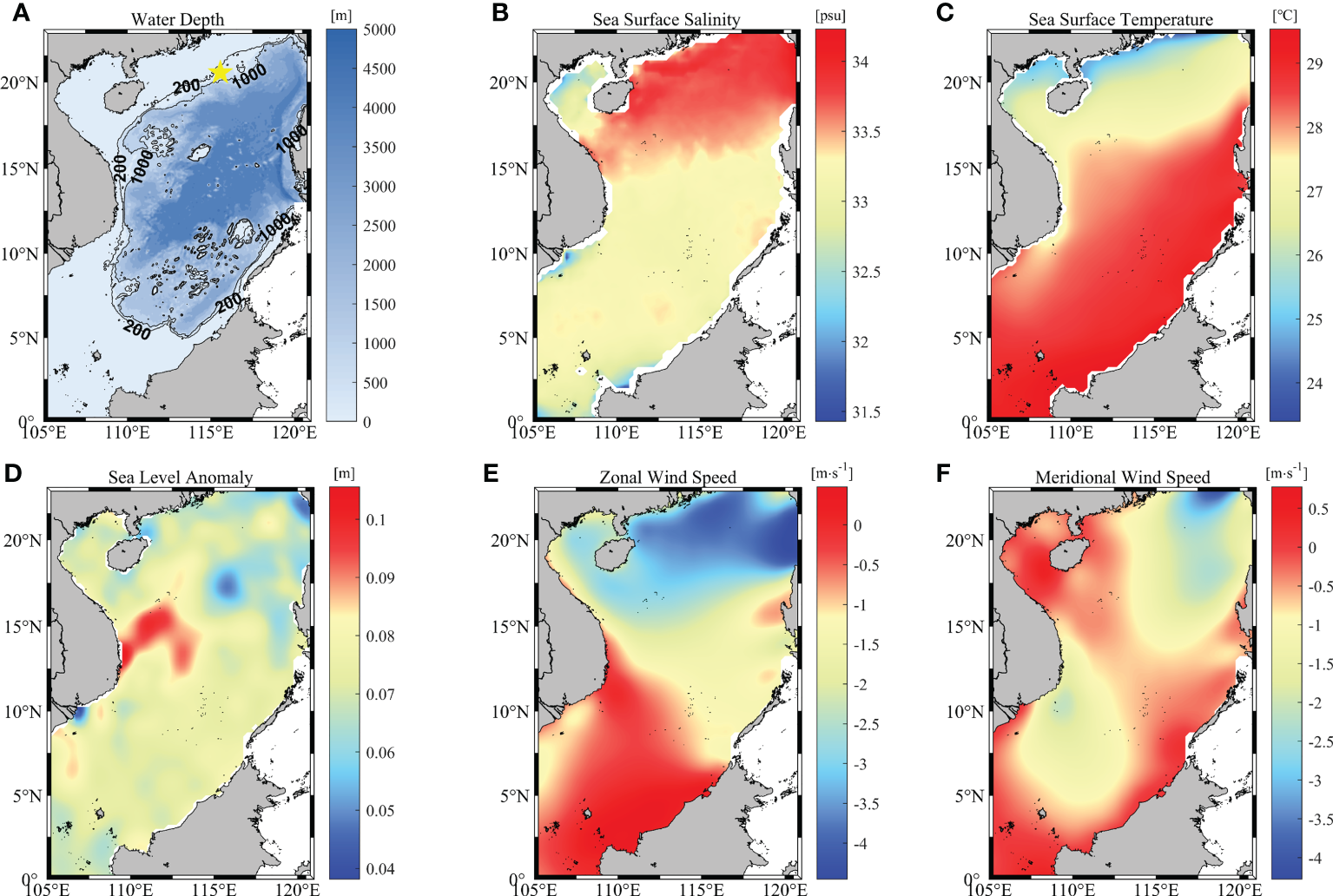 (A) Distribution of water depth in the SCS. Contours of 200 m and 1000 m depth are overlaid with black lines, and the location of a mooring station is marked as a yellow pentagram. (B–F) Climatology of sea surface variables in the SCS from 2010 to 2018. (B) Sea surface salinity, (C) sea surface temperature, (D) sea level anomaly, (E) zonal and (F) meridional wind speed.