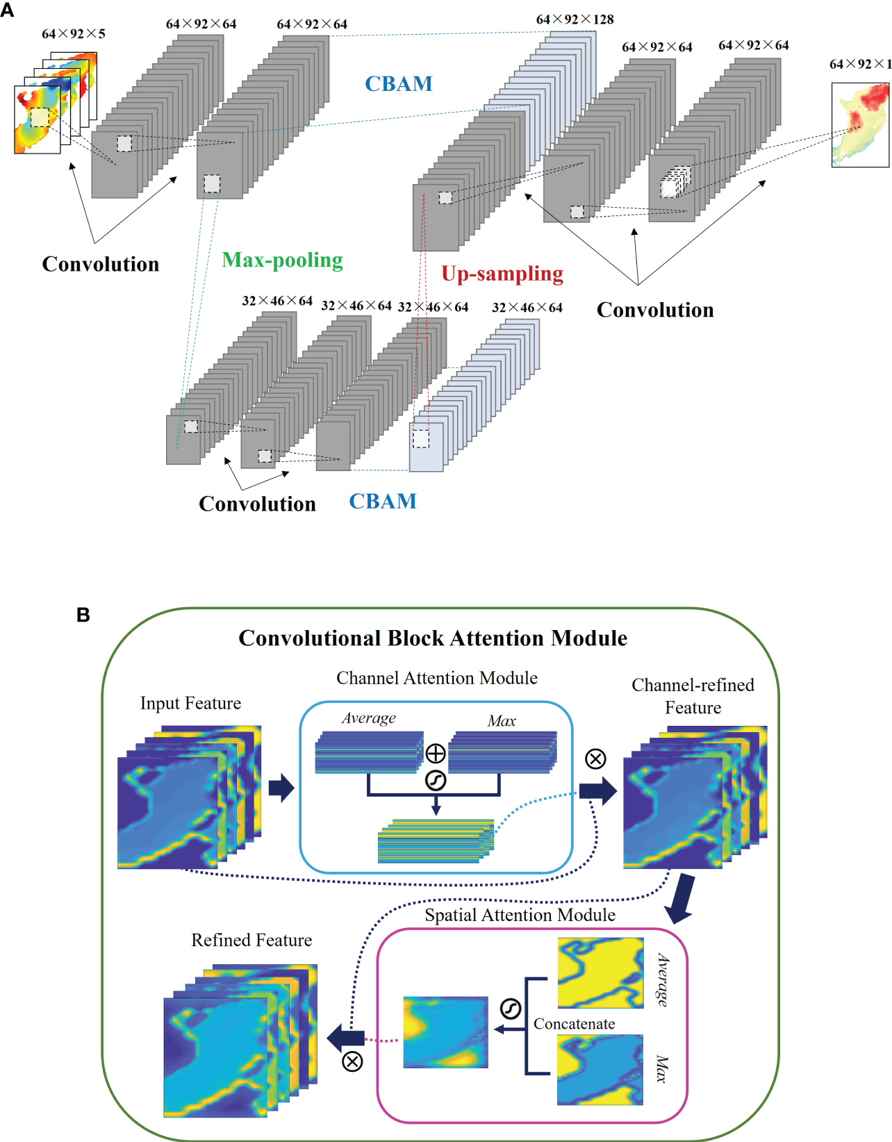 (A) Schematic diagram of Attention U-net model. The subtitles “Convolution”, “Maxpooling”, “Up-sampling” and “CBAM” represent the specific operations between two layers. (B) Schematic diagram of CBAM structure and sub-modules.