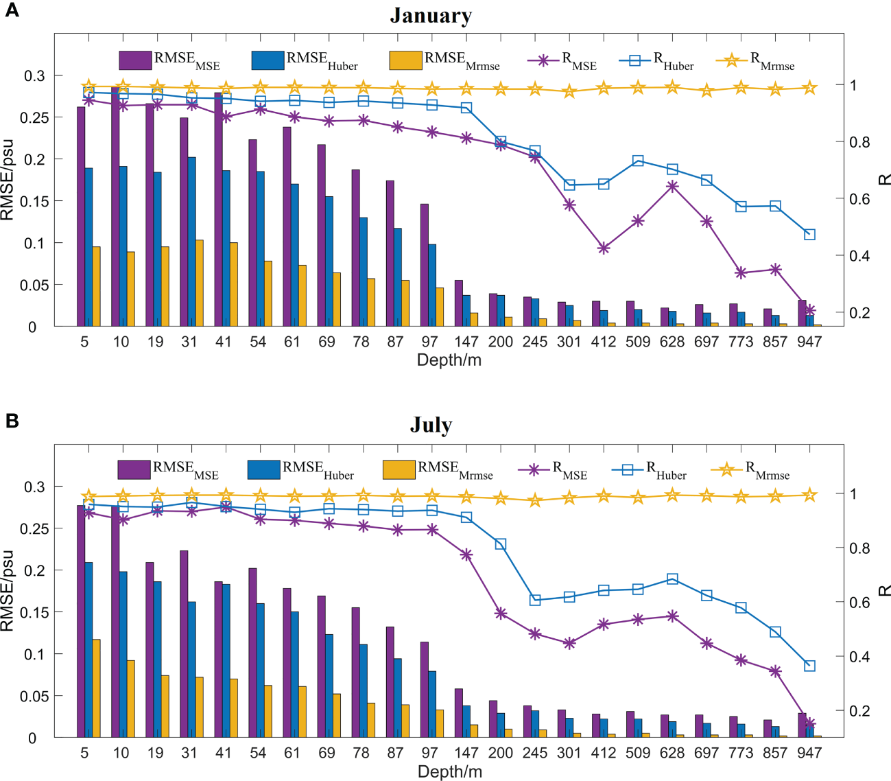 Variations of RMSE and correlation coefficient (R) between Attention U-net estimated salinity and GLORYS2V4 reanalysis as a function of water depth in the SCS in January (A) and July (B). The subscripts “MSE”, “Huber” and “Mrmse” of RMSE and R represent the estimation derived from the model based on MSE, Huber and Mrmse loss functions, respectively.