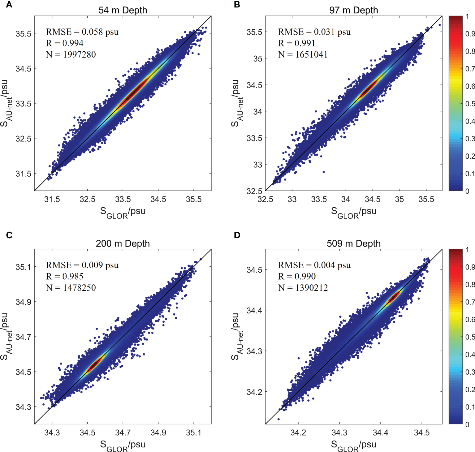 Density scatterplots between the Attention U-net model estimated salinity (SAU-net) and GLORYS2V4 reanalysis (SGLOR) at the depth of (A) 54 m, (B) 97 m, (C) 200 m and (D) 509 m in the SCS. The black line indicates the 1-to-1 line. N is the number of data points in all testing samples.