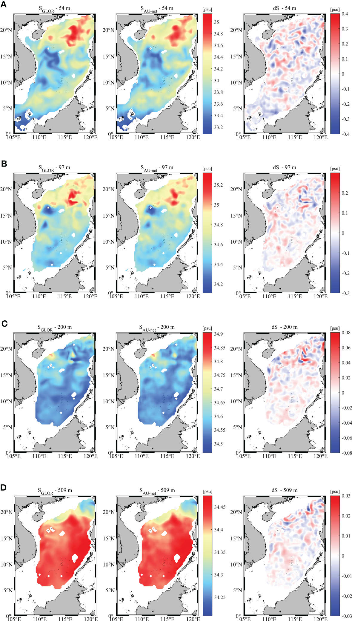Distribution of salinity field estimated by the Attention U-net model compared to the GLORYS2V4 reanalysis and their difference (dS = SAU-net – SGLOR) at the depth of (A) 54 m, (B) 97 m, (C) 200 m and (D) 509 m in the SCS on 1 May 2018.