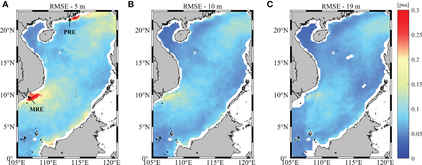 In contrast, the Mrmse loss function only calculates the errors between the estimation and ground truth at valid data points without consideration of outliers. When the Mrmse loss function is used, the model yields the most accurate construction results, especially in deeper waters. The RMSE at different vertical layers between the labelled and estimated salinity is half or even less than 85% of the error obtained by using the Huber loss function. The error decreases significantly as the water depth increases and the minimum value is 0.002 psu at 947 m depth. Meanwhile, the correlation coefficient is significantly increased from 23.0% to 108.9% in waters deeper than 200 m and its value remains above 0.975. It is marginally larger in the upper waters and changes slightly with the water depth. Similar results were obtained for the model in July (Table 1 and Figure 3B), where the RMSE has a large reduction between 44.0% and 86.7% and the correlation coefficient has a significant increase of 2.8% to 172.8% at different depths. This shows that the Mrmse loss function works better than the MSE or Huber loss function for 3D salinity reconstruction in the SCS. The Huber loss function greatly reduces the attention on the anomaly values, however, it is still not effective for the establishment of 3D salinity reconstruction model in the SCS, because invalid data always exist due to uneven distribution of topography. These invalid data regarded as outliers would induce noise in the training dataset and thus provide false data features, which may lead to unsatisfactory performance of the reconstruction model. On the other hand, the salinity changes slightly within a month. In this case, different features learned by the network are relatively few, and hence false features would have a considerable negative impact on the model performance. The influence of outliers on the model is particularly great in the deeper layers because the number of real salinity data will decrease with depth. When evaluating model errors between estimation and labels over the study domain, the model will learn unnecessary features from the outliers and pay relatively less attention to the useful information of the valid data. Ignoring outliers in the loss function can help the model efficiently learn the characteristics of the real salinity field and yield an estimation close to the ground truth. The generalization ability of the model can be significantly improved as well. Thus, the introduction of the Mrmse loss function in the Attention U-net model has effectively improved the accuracy of salinity reconstruction result at all layers, especially in deeper waters of the SCS.