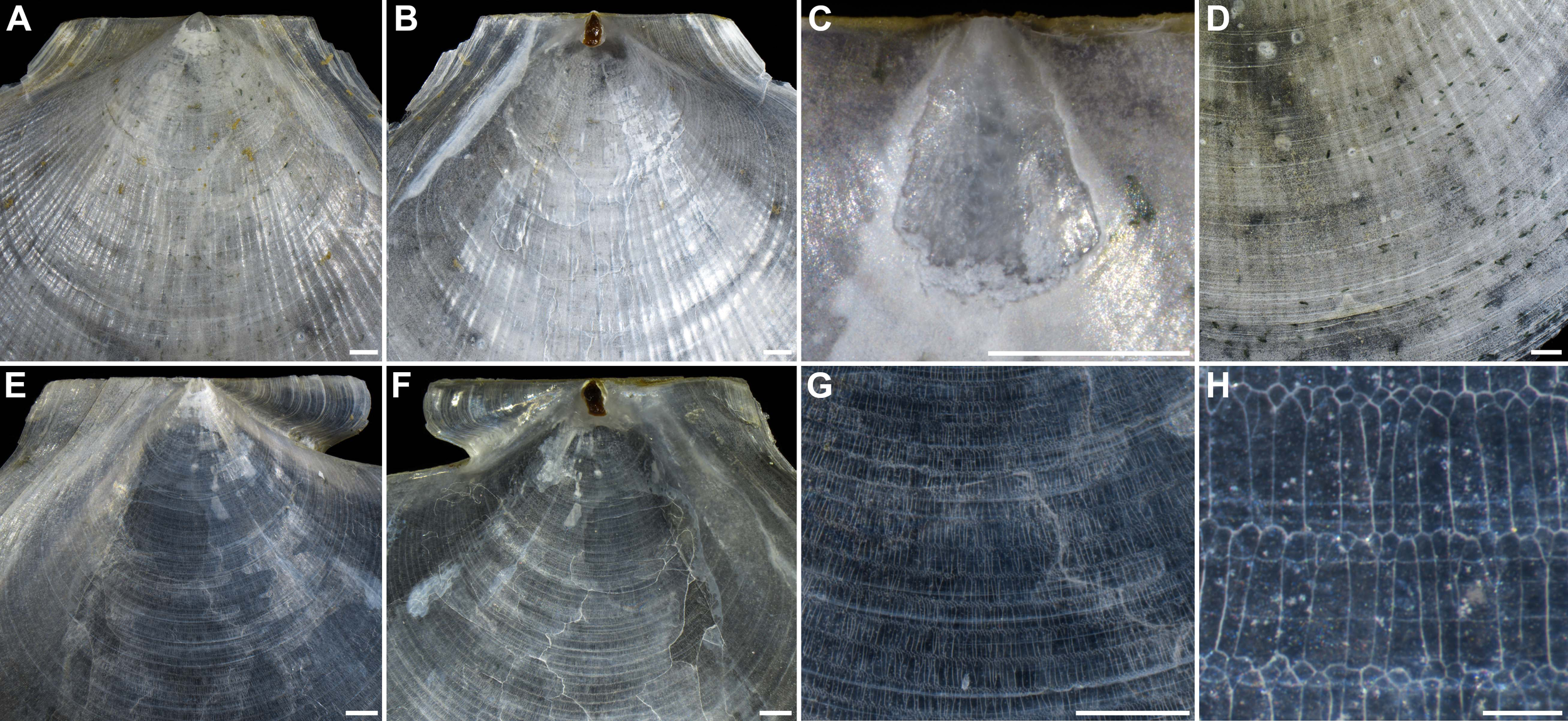 Right valve. Disc slightly convex (Figure 2), thinner, more fragile and transparent than left valve. Regular, rippled, and rounded commarginal striae distinctly presented on the external and internal surfaces, intersected with longitudinal stripes of prisms (Figures 3E–G); prisms distinct, with alternating spherulitic and elongated layers, and clear distal and proximal growth lines, alternated with the rounded striae (Figures 3G, H). Auricles unequal; anterior auricle low-angle sector-shaped and inflated, with clear, rounded, coarse commarginal ribs and ridges, protruding with rounded anterior end, sharply demarcated from shell disc with a deep notch and gorge; posterior auricle triangular, with parallel, dense, indistinct striae and some distinct ridges, continuous connected to shell disc with slight turn (Figures 3E, F). Adductor muscle scar oval and clear (Figures 2D–L, 3F). Umbo very compressed and inconspicuous.