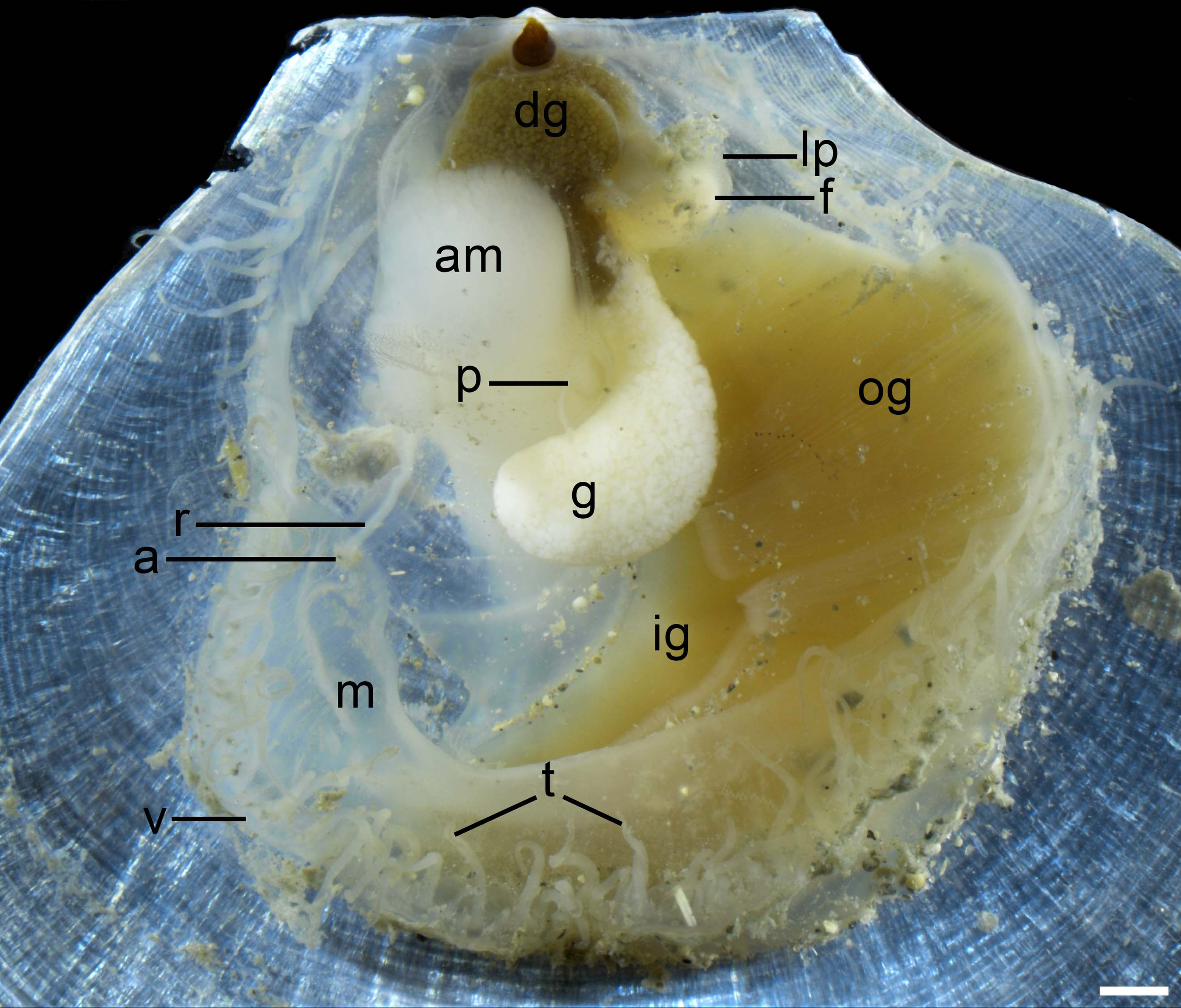 Anatomy features of Catillopecten margaritatus n. sp. of the paratype 1 (TMBC, SCSMBC031007) left valve. Abbreviations: a, anus; am, adductor muscle; dg, digestive gland; f, foot; g, gonad; ig, inner gill; lp, labial palp; m, mantle; og, outer gill; p, pericardium; r, rectum; t, tentacle; v, velum. Scale bar: 1 mm.