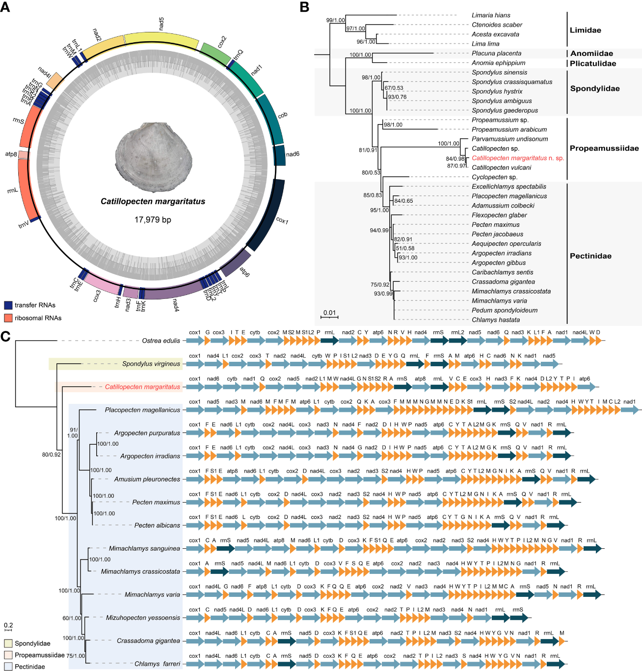 Mitogenome features of Catillopecten margaritatus n. sp. and its phylogenetic position. (A) Mitogenomic gene orders and relative lengths. (B) Phylogenetic tree of the order Pectinida based on 18S rRNA fragments. The topology is based on BI analysis, with Limidae as the outgroup. The accession numbers are presented in Table S1. (C) Mitogenomic phylogenetic tree based on protein coding genes and rRNAs and the mitochondrial gene arrangements of the superfamily Pectinidea species. The topology is based on BI analysis, with Ostrea edulis as the outgroup. Posterior probabilities values (>0.50) from BI analysis and bootstraps values (>50) from the ML analysis are given at the nodes.