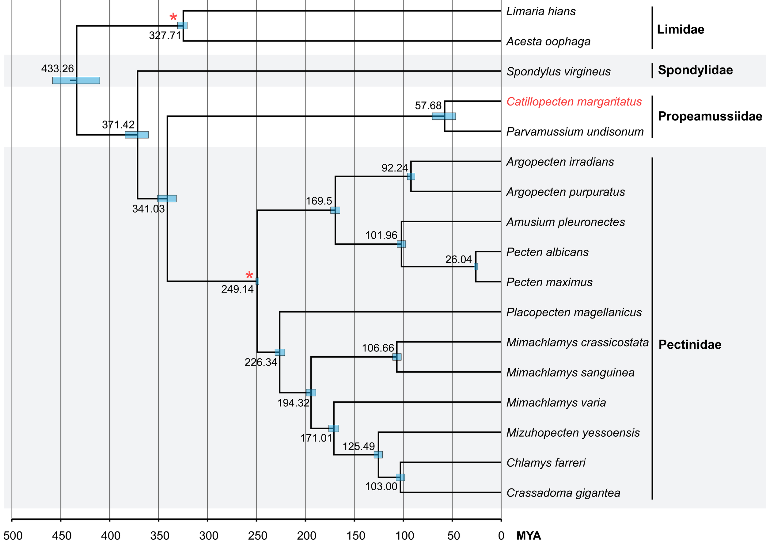 Divergence time estimation analysis of Pectinoidea based on concatenated mitochondrial PCG gene sequences. Bottom axis represents millions of years and the internal nodes calibrated by fossil records are represented by red asterisks. The 95% highest posterior density (HPD) is indicated as node blue bars and the Bayesian posterior probabilities of all nodes are 1.00.