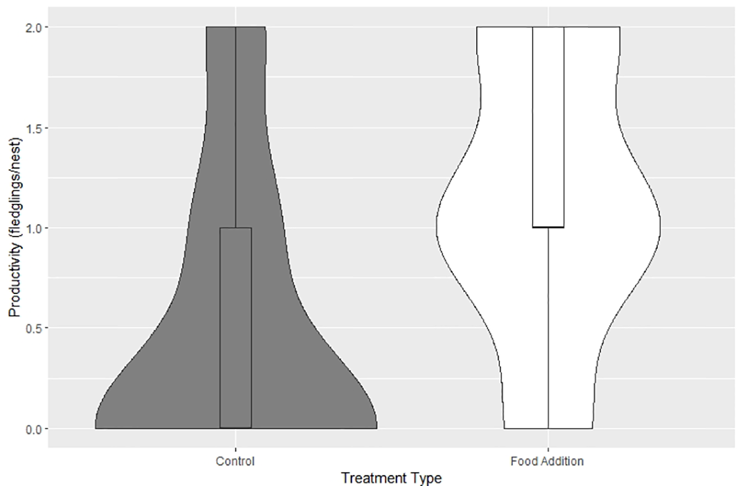 Productivity between the control group (N = 15) and the treatment group (N = 16) of ospreys during the 2021 breeding season in the lower Chesapeake Bay, VA, USA (β = 0.88, SE = 0.45, pseudo R2 = 0.14, CI =0.049, 1.825, P= 0.048). Violin shapes represent the density of data distribution and the middle horizonal line of the box plots represent the median values.