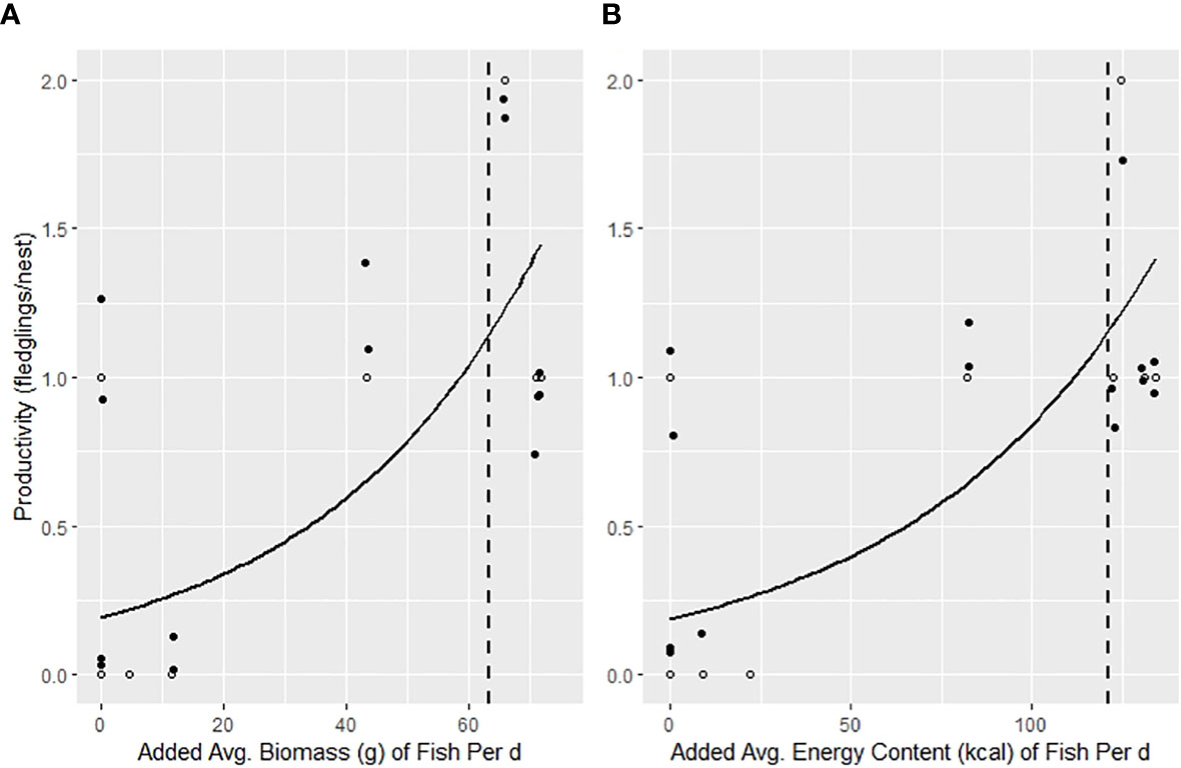 GLM’s of the influence of the added (A) avg. biomass/d/nest (β = 0.03, SE = 0.01, Pseudo R2 = 0.60, CI = 0.01, 0.05, P = 0.02) and (B) avg. energy content/d/nest (kcal) (β = 0.02, SE = 0.005, Pseudo R2 = 0.64, CI = 0.006, 0.03, P = 0.02) for osprey pairs under trail camera surveillance after seven weeks post hatch of the first egg in 2021 breeding season in the lower Chesapeake Bay, VA, USA. The data points represented by white circles have been “jittered” along with random points represented in black circles for improved visibility of model fit. The dotted lines indicate the supplemented average biomass (63.4 g) and energy content (121 kcal) thresholds needed per d to produce 1.15 young per nest-season.