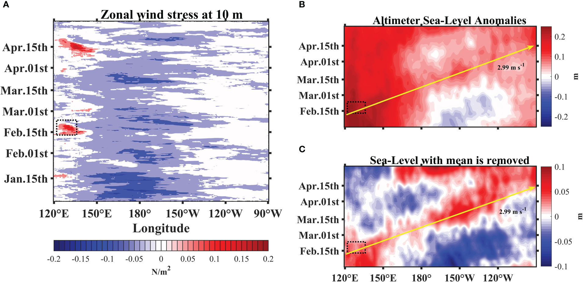 Longitude-time plots of daily anomalous (A) zonal wind stress at 10m, (B) sea surface height, (C) sea surface height with the mean is removed. Wind stress anomalies are averaged between 5°S and 5°N. Sea surface height anomalies are averaged between 2°S and 2°N and filtered using the mean filter. The dashed area denotes the TS Dujuan activity region. The solid yellow arrow denotes the estimated observed Kelvin wave speed.