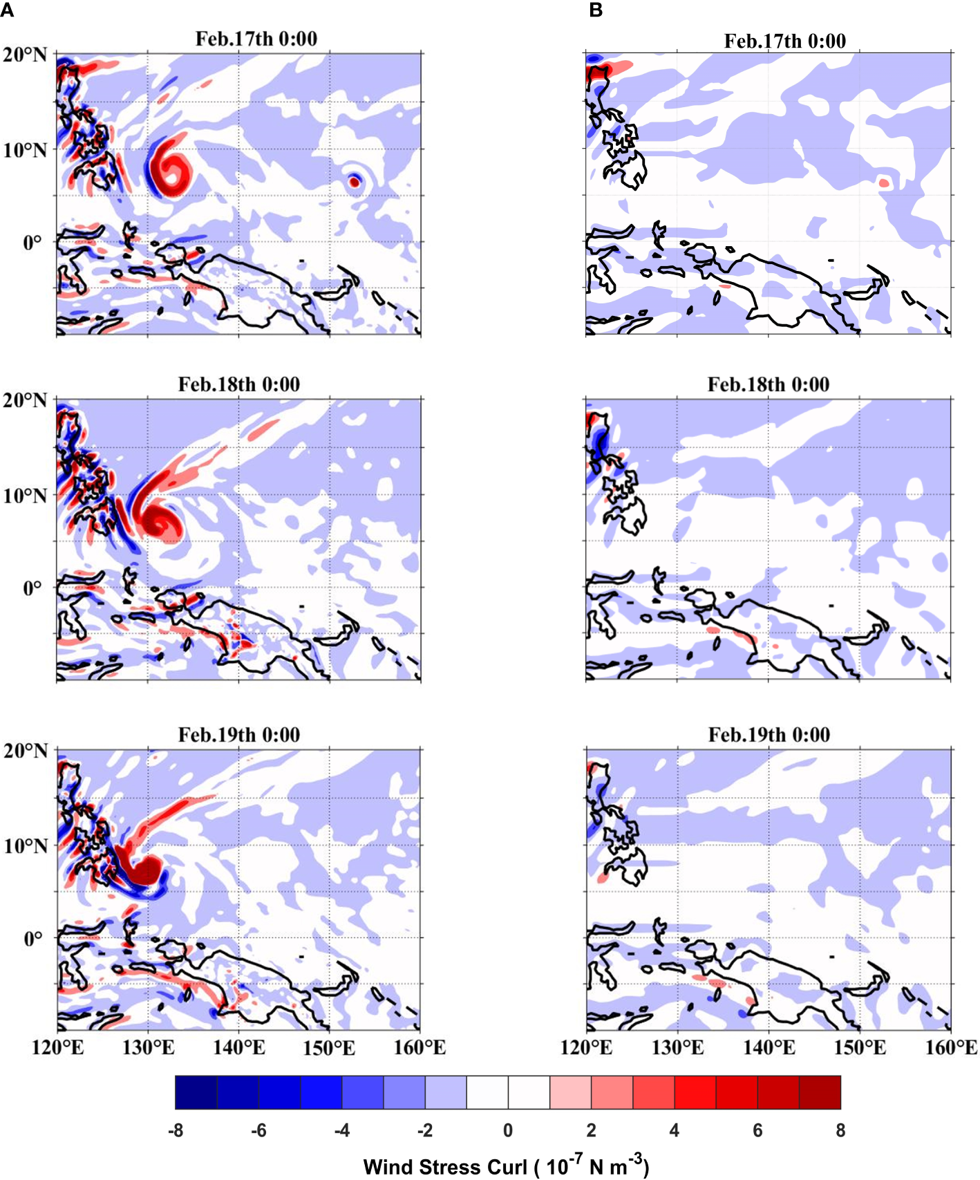 Wind stress curl from February 17th to 19th (A) the original data, (B) the filtered data.