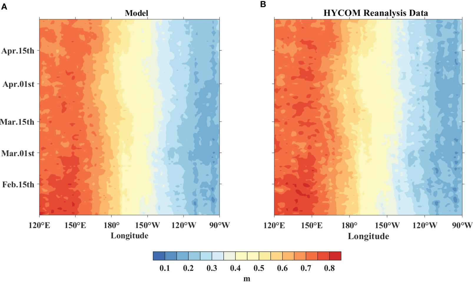 Longitude-time plots of daily SSH (within 5°S-5°N), for (A) the model simulation, (B) the HYCOM+NCODA Global 1/12° Reanalysis Data.