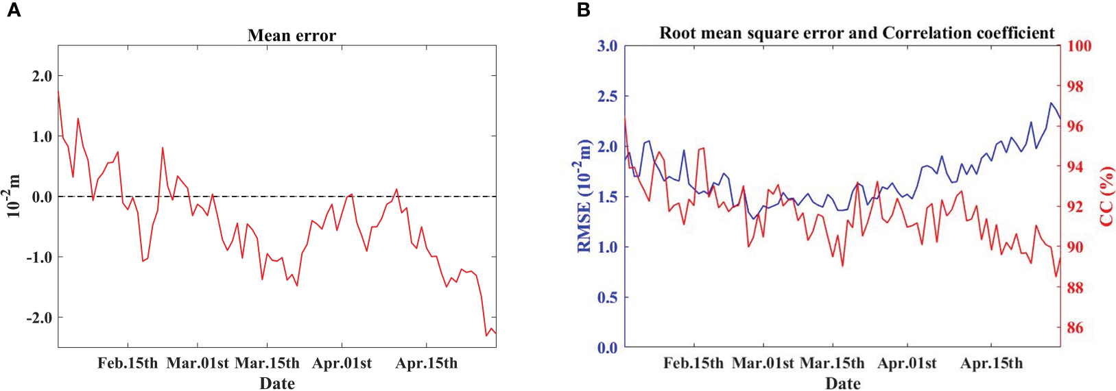 The evaluation indices of daily sea surface height, for (A) the mean error, (B) the root mean squared error, and correlation coefficient.