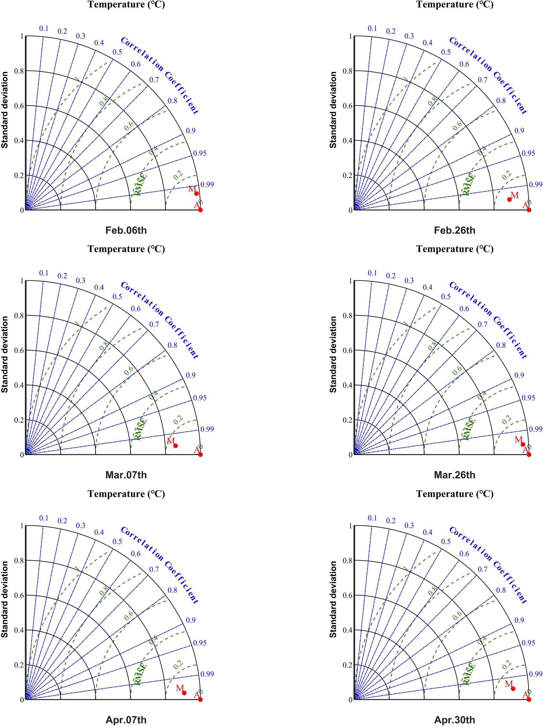 Taylor plots of 0-300 m vertical temperature distribution. Point M represents the index calculated from the model data compared to the Argo buoy data (point A). Standard deviation and root mean square error were normalized.