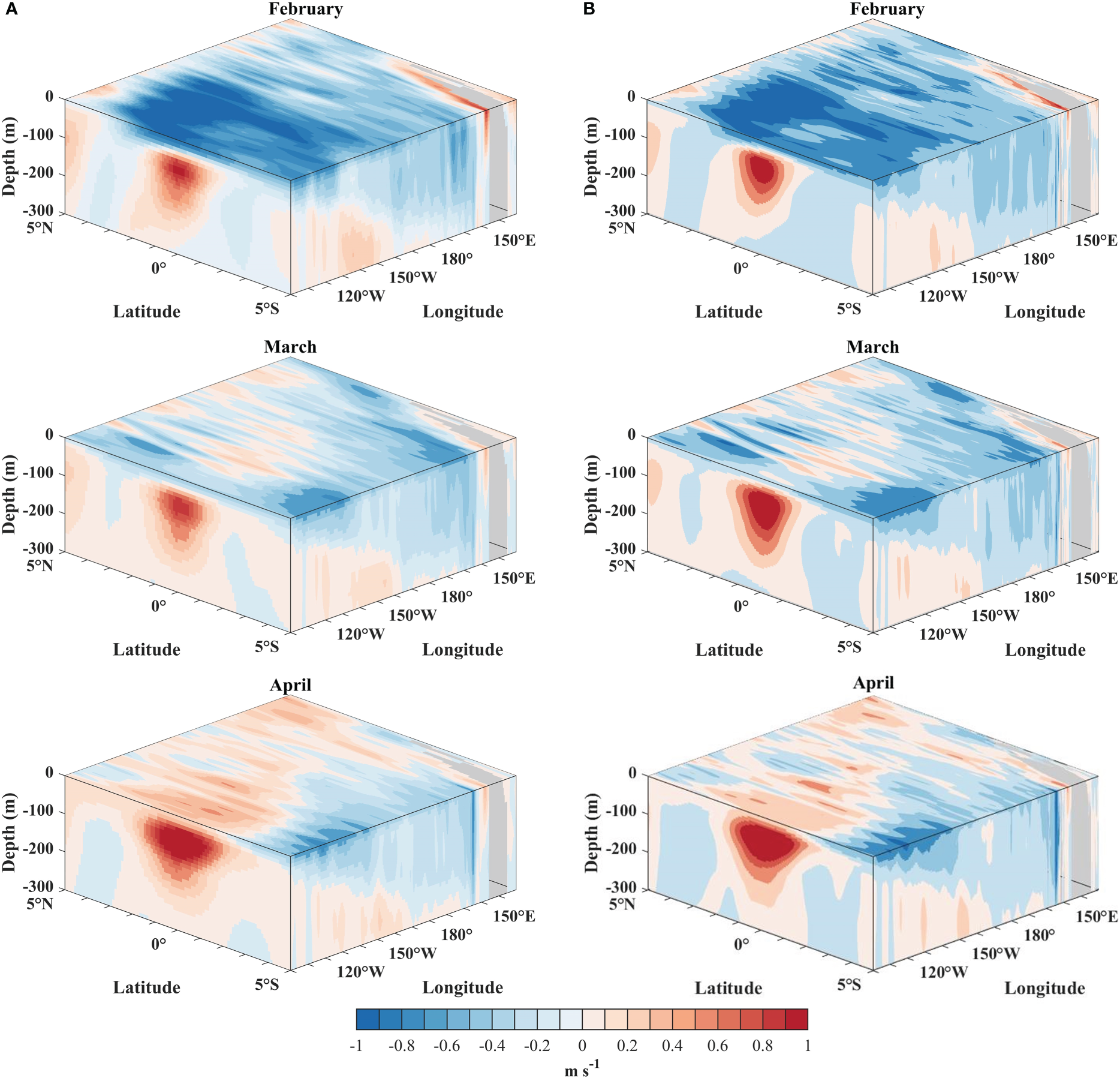 The 3D plots of the monthly mean zonal velocity between 0 to 300 m, for (A) the model simulation, and (B) the NEMO Reanalysis Data.
