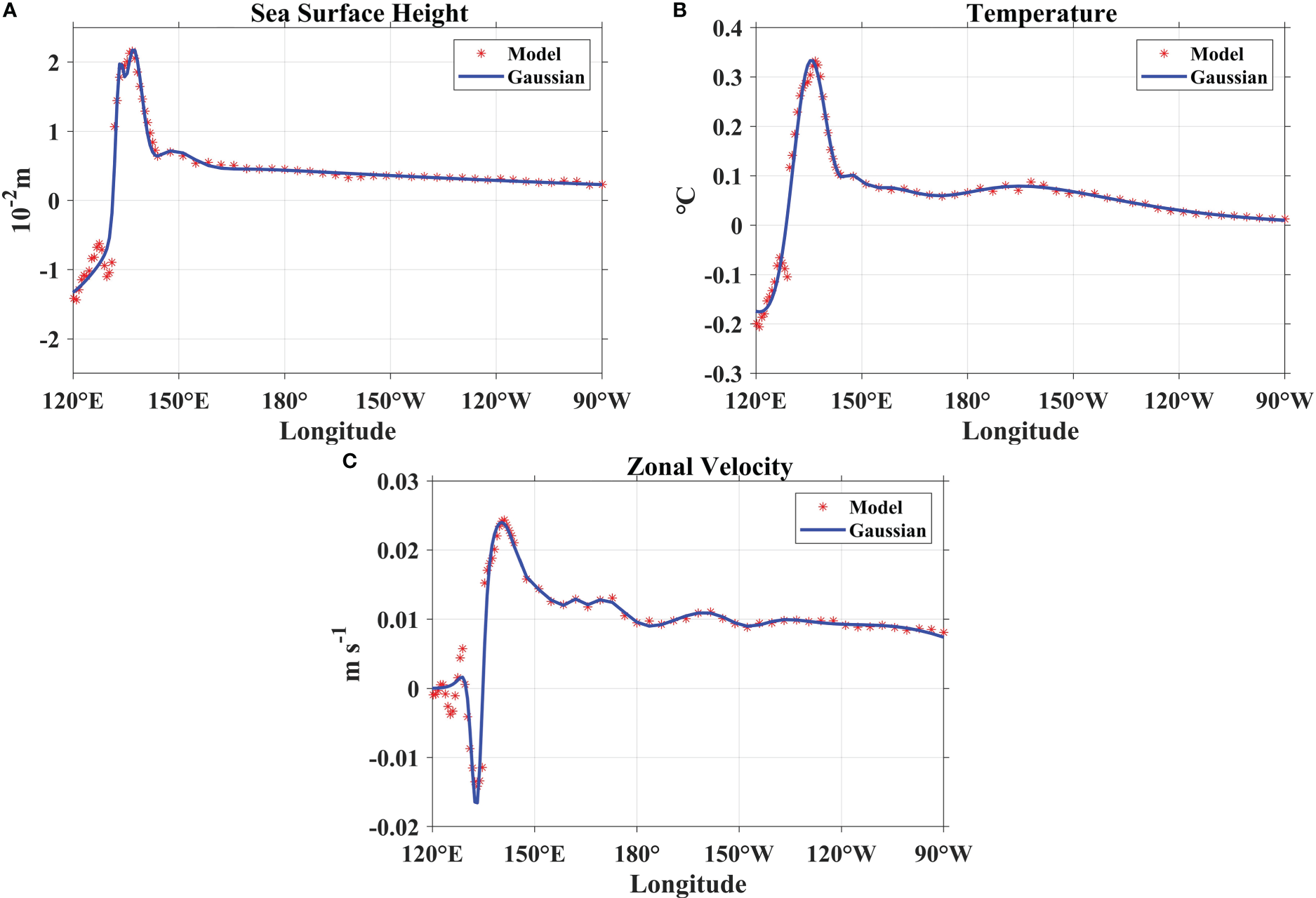 The differences of (A) sea surface height, (B) 100-200 m upper ocean temperature, (C) 100-200 m upper ocean zonal velocity. The solid line is obtained from the model data by Gaussian fitting. The data is selected along the yellow arrow in Figures 11C, G, I.
