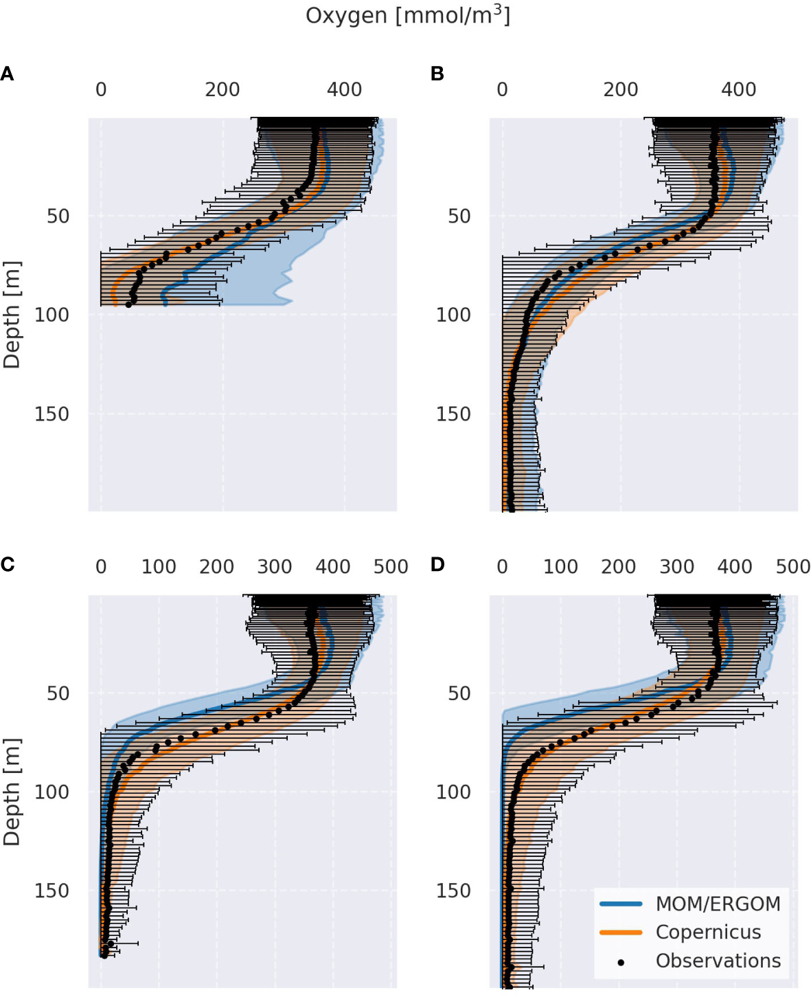 Climatological mean oxygen profiles (averaged from 1948 to 2018) for all sub-basins studied [Bornholm Basin (A), eastern Gotland Basin (B), northern Gotland Basin (C), and western Gotland Basin (D)]. Colored translucent and black hatched areas for model data and observations, respectively, show the variability (+- 2 s.d.).