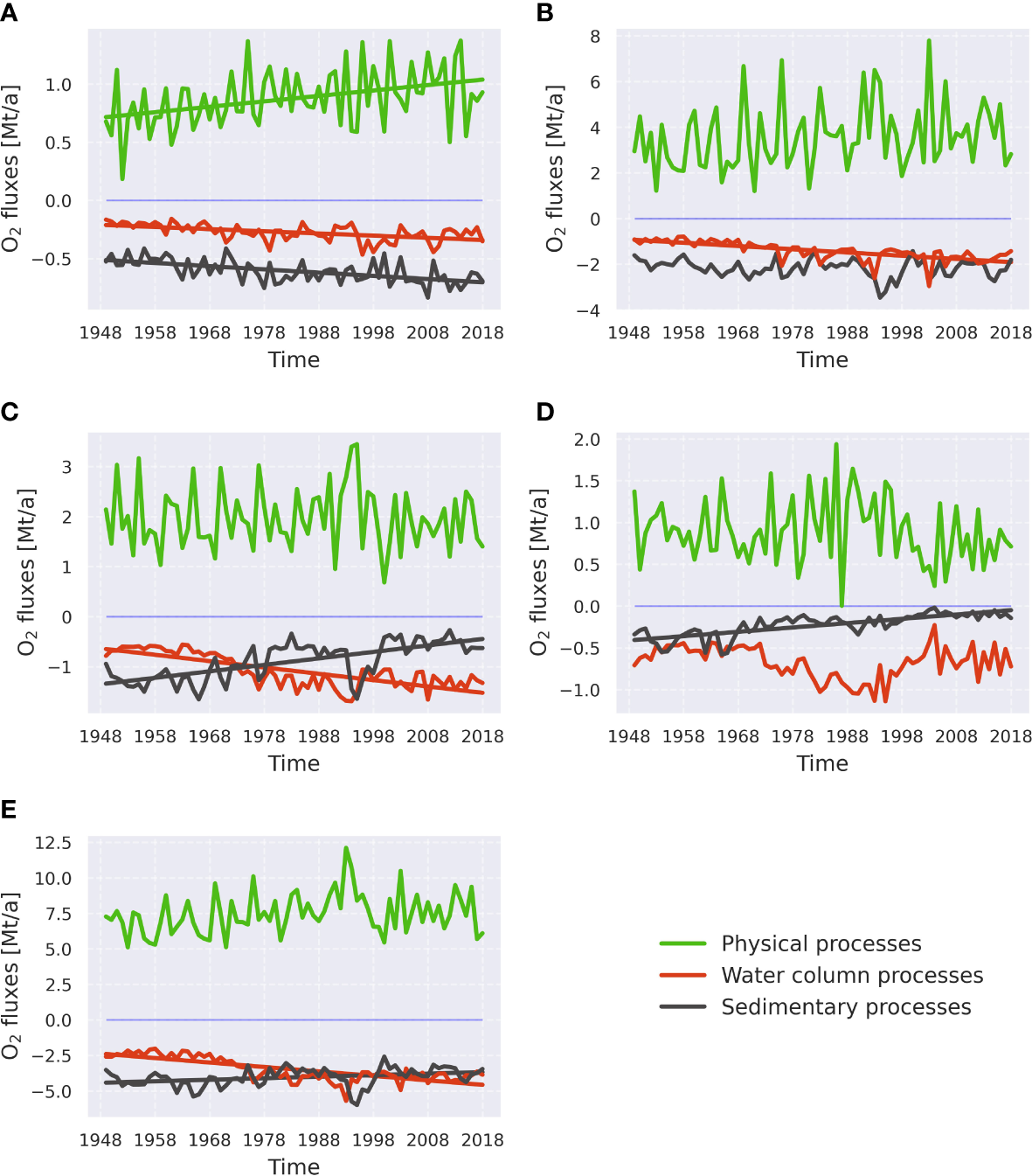 Linear trends of groups of processes governing oxygen dynamics in the sub-basins, namely the Bornholm Basin (A), the eastern Gotland Basin (B), the northern Gotland Basin (C), the western Gotland Basin (D), and the whole central Baltic Sea (E). The groups of processes are identical to those in Figure 4. Trend lines are only shown if they are significant (p<0.05). Mt/a stands for 109 kg per year. See Supplementary Table 1 for more information about processes in each category.