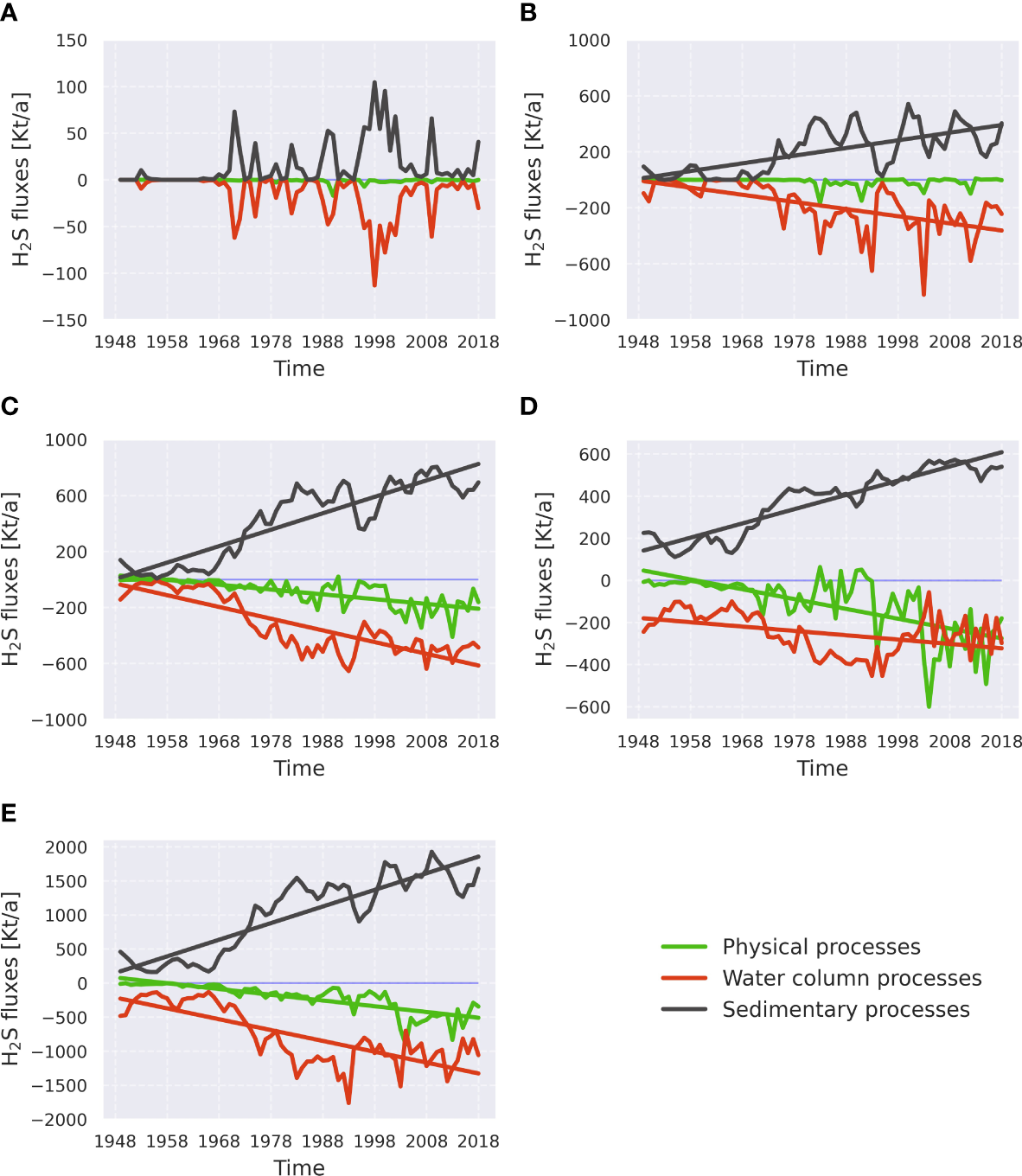 As Figure 5 but for hydrogen sulfide. The order of subplots is the same as in Figure 5: (A) - the Bornholm Basin, (B) - the eastern Gotland Basin, (C) - the northern Gotland Basin, (D) - the western Gotland Basin, and (E) - the whole central Baltic Sea. Kt/a stands for 106 kg per year. See Supplementary Table 2 for more information about processes in each category.