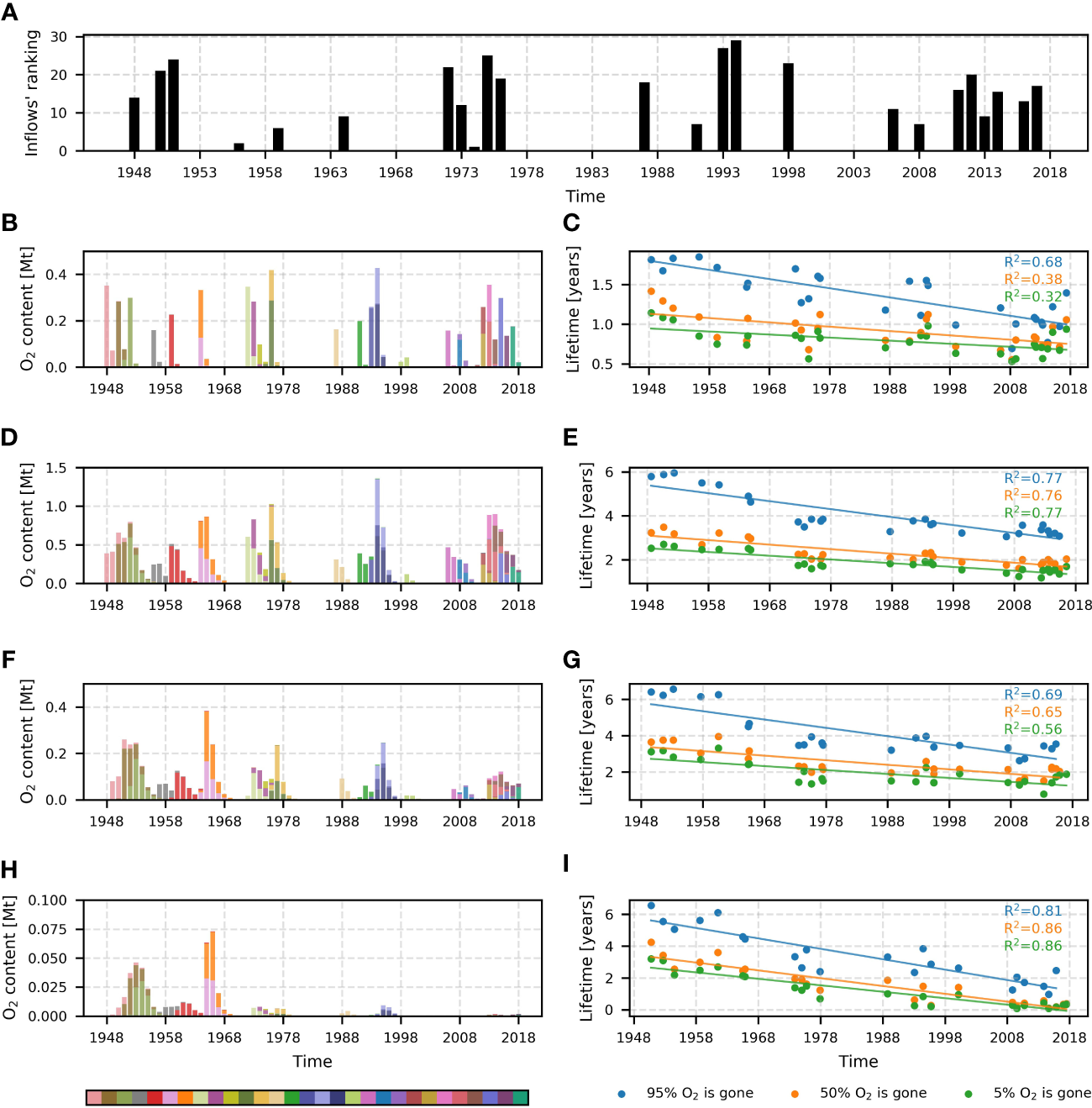 Ranking of inflows based on the total amount of oxygen transported across the Arkona transect during the inflow event panel (A). Number 29 stands for the inflow that transported the most oxygen, and number 1 for one that transported the least oxygen. The total yearly content of oxygen transported by saltwater inflows to different sub-basins is depicted in panels (B, D, F, H). Different inflows are shown as different colors in the histogram. Bar heights represent the inflow’s O2 content in a certain sub-basin. The color bar shows the colors of inflows in chronological order (the earliest inflow is pink, the next one is brown, etc.). Panels (C, E, G, I) show the lifetime of inflow oxygen for each sub-basin (dots). Lifetime is defined as the time when inflow oxygen reaches a certain fraction of its maximal value. Three fractions are shown: 5% of inflow O2 is consumed (95% remaining) - green dots, 50% of inflow O2 is consumed (50% remaining) - orange dots, 95% of inflow O2 is consumed (5% remaining) - blue dots. Linear trends, demonstrating the decay of inflowing O2 lifetime, are shown for each scatter plot. Determination coefficients (R2) for each linear trend are presented in the upper-left part of the panels. Their colors indicate the trends they belong to. Panels (B, C) stand for Bornholm Basin, (D, E) – for eastern Gotland Basin, (F, G) – for the northern Gotland Basin, H and I – for the western Gotland Basin. Mt corresponds to 109 kg.